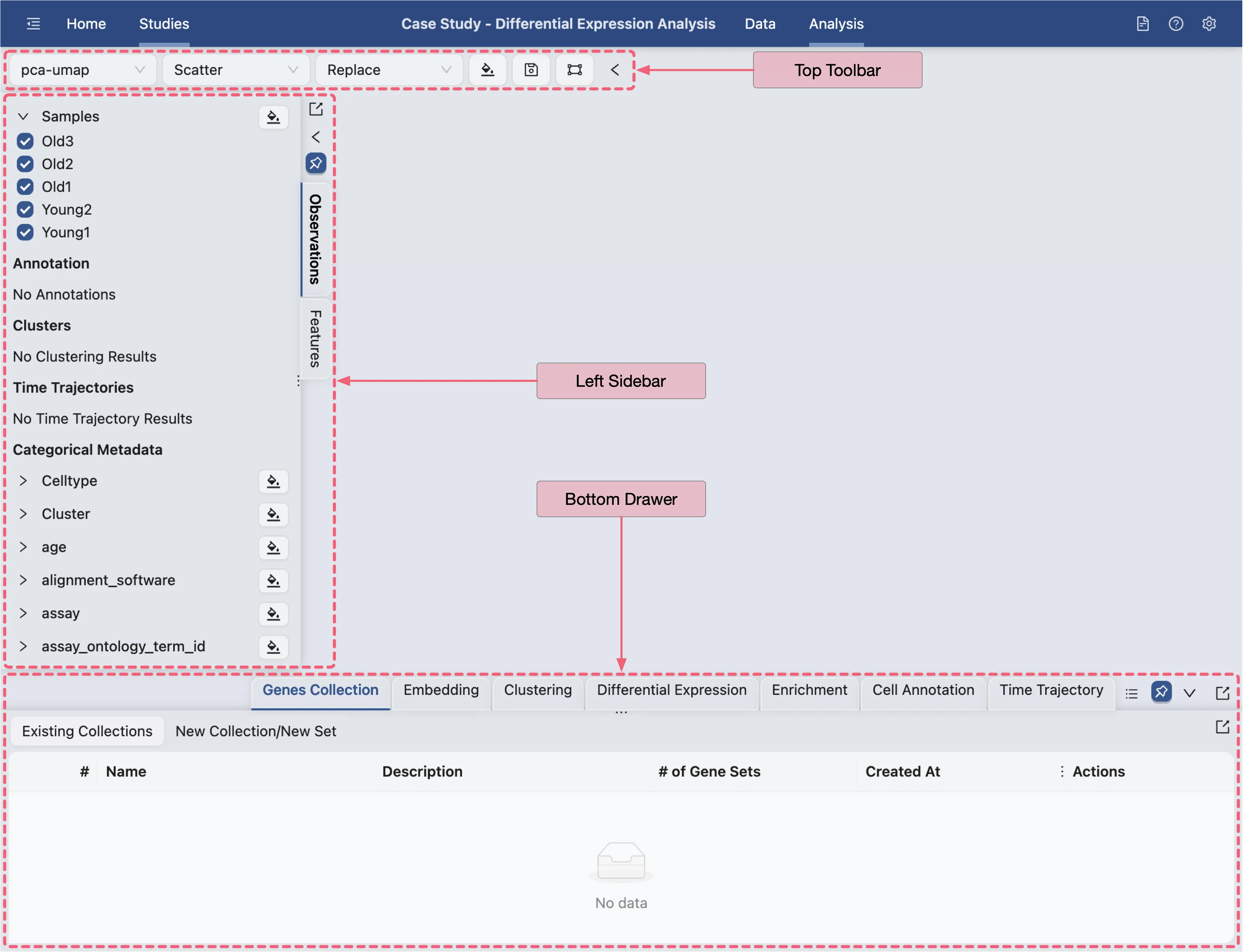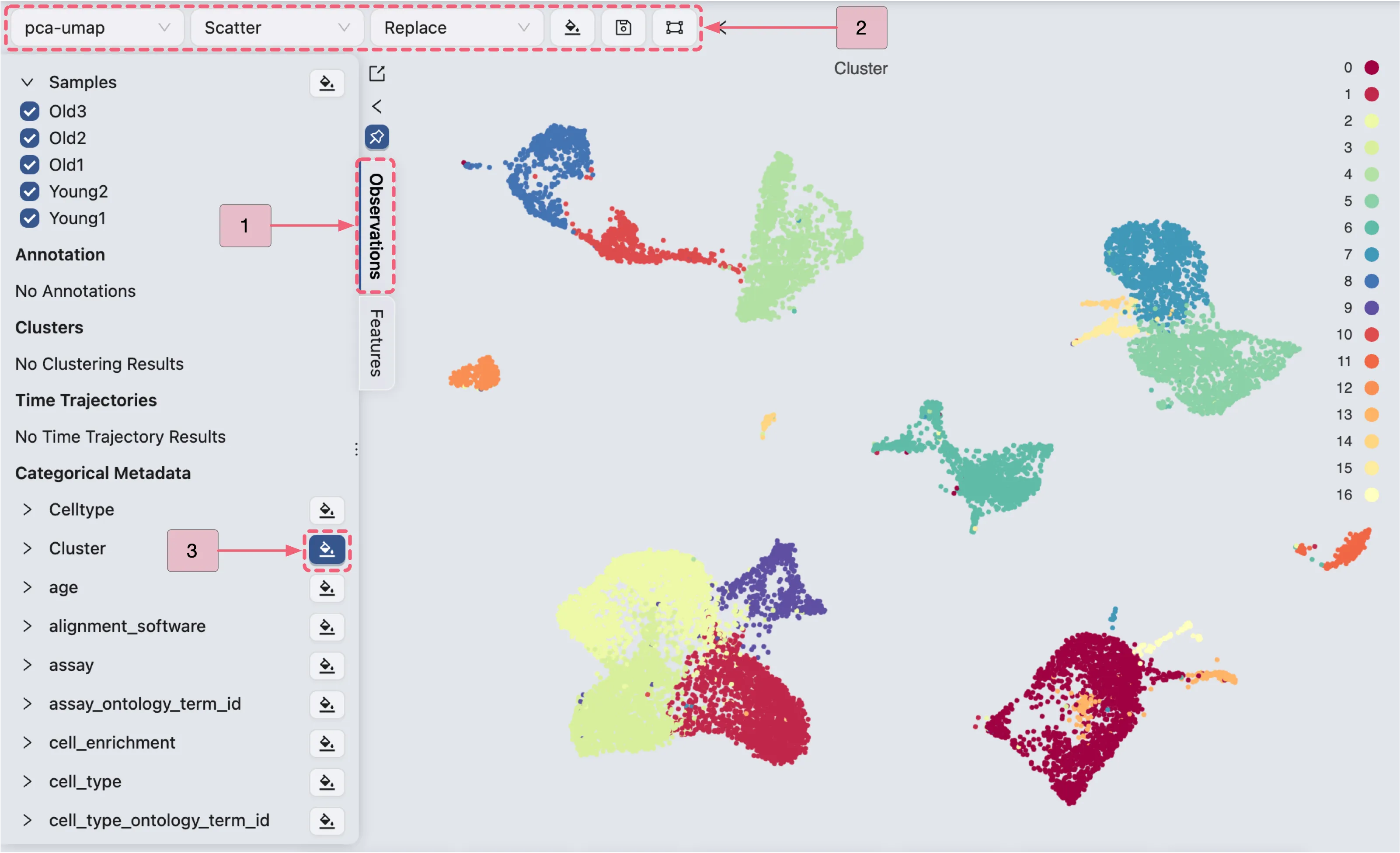 Top Toolbarsettings are configured as follows:pca-umap: Indicates the embedding to be used for visualization.Scatter: Defines the plot type to be displayed.Replace: Specifies the blending mode for the visualization.