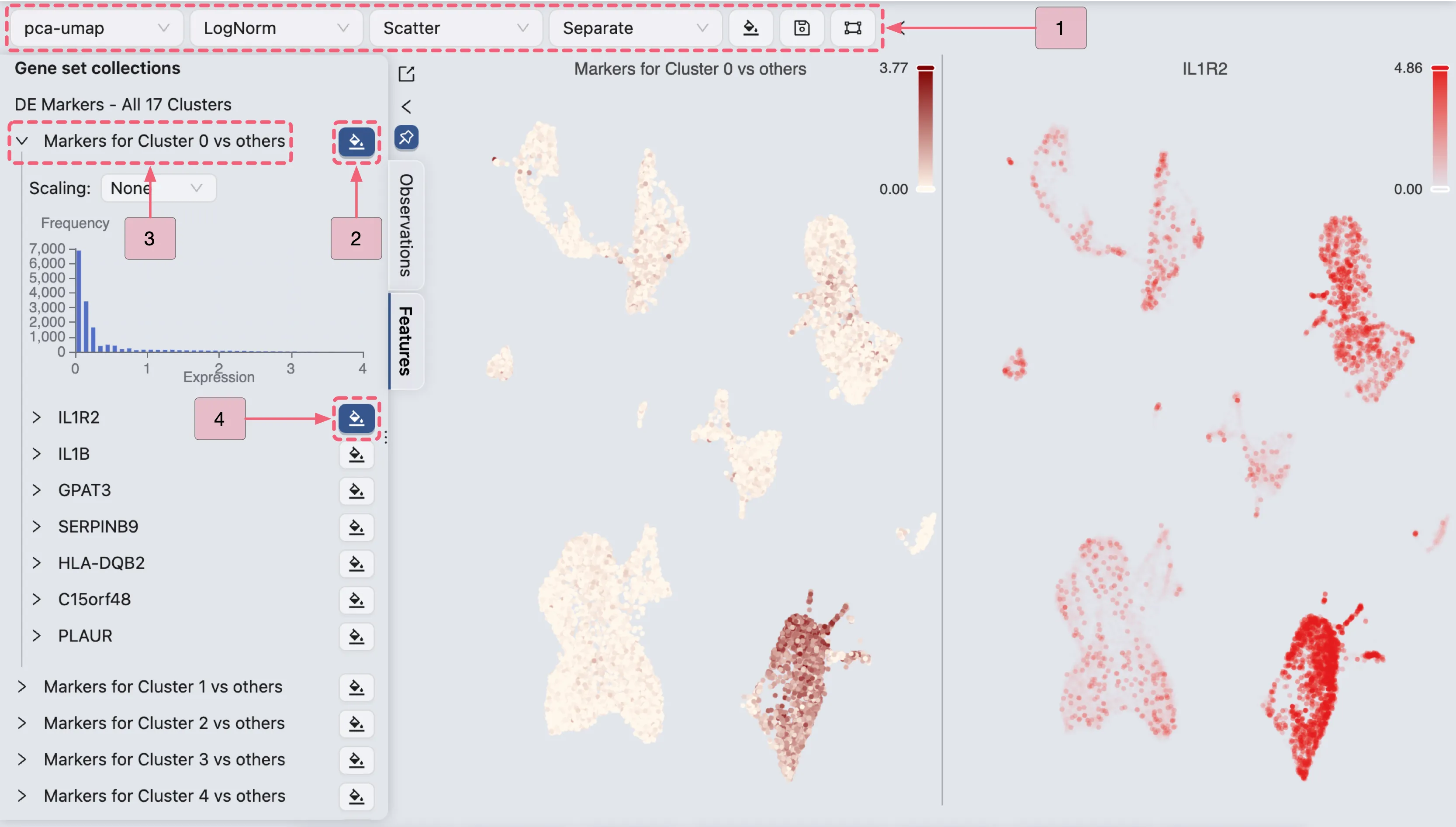 Then, proceed with the steps below to visualize Cluster 0 marker genes (as shown in the image):