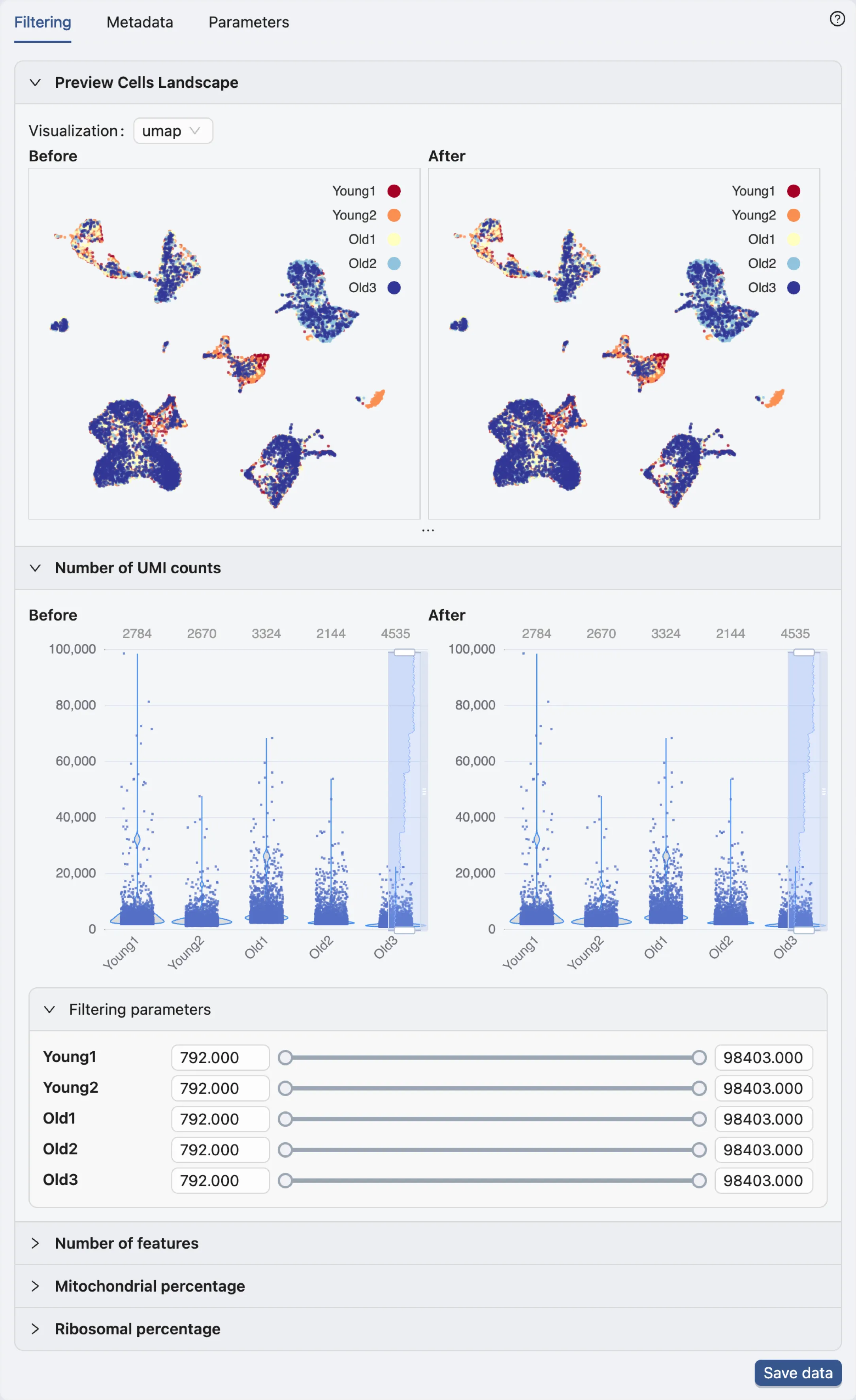 Note: The authors have already removed potential doublets (cells expressing more than 75,000 genes), and potential apoptotic cells (cells with more than 5% of mitochondrial reads). For additional details on the filtering methodology, refer to the publication.