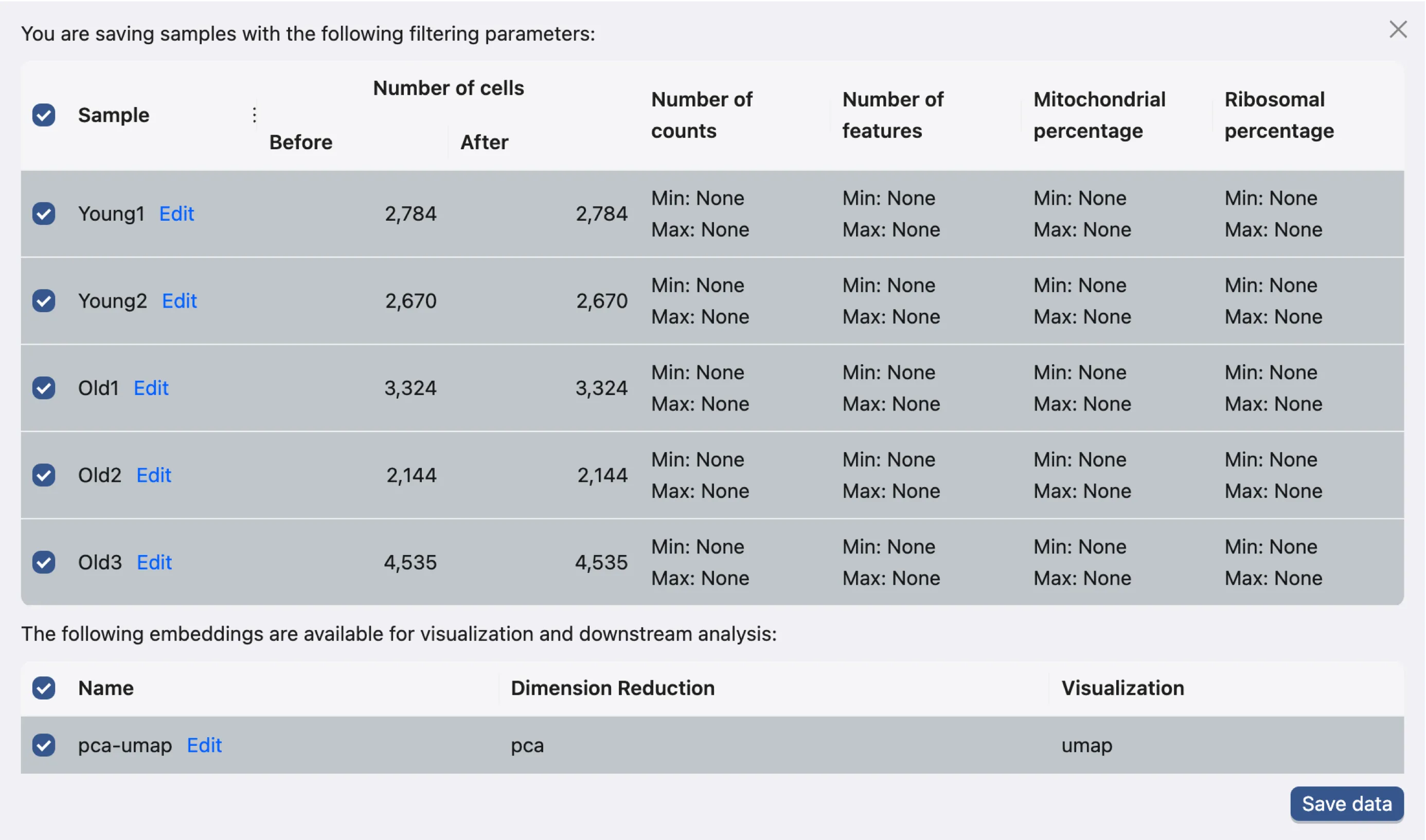 This dialog enables you to choose which samples and embeddings to save. For this tutorial, we will save all samples and embeddings.