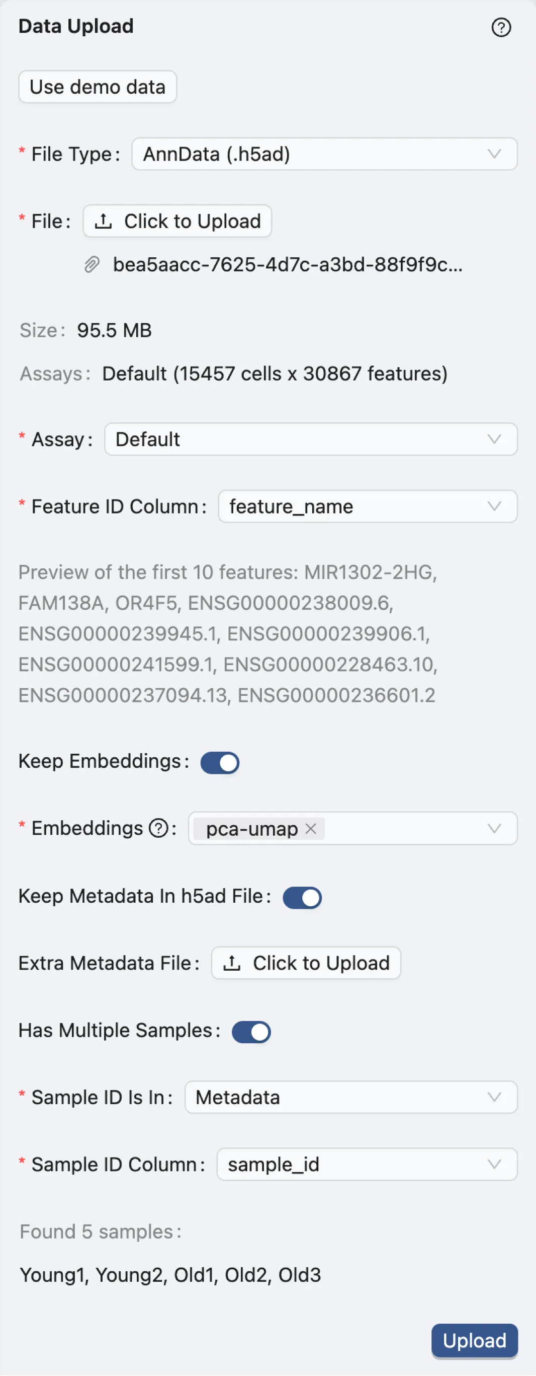 In this dataset, the cell IDs named cellid in the obs dataframe instead of using the default format. After uploading: