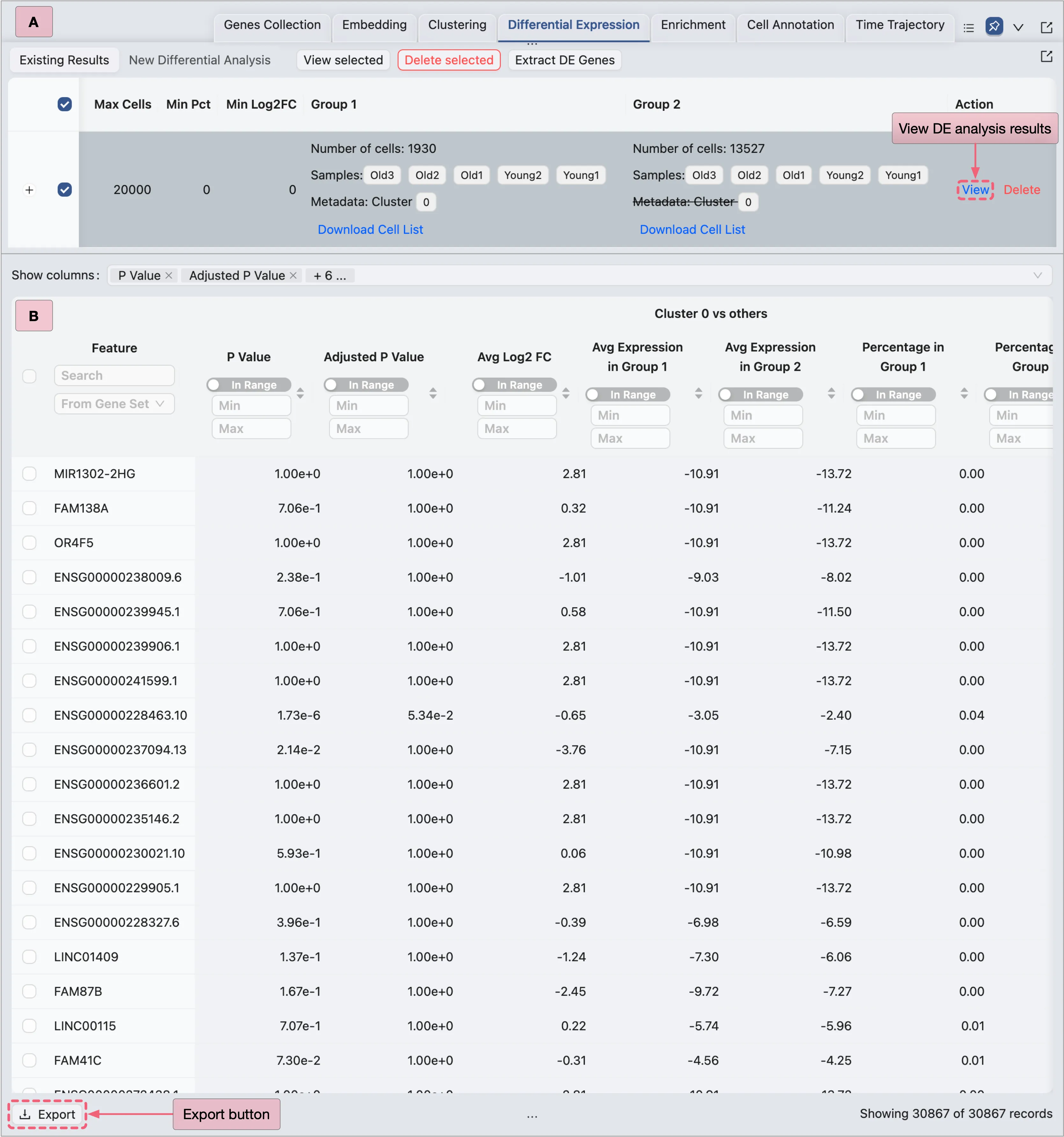 On the DE analysis results page, you can:
