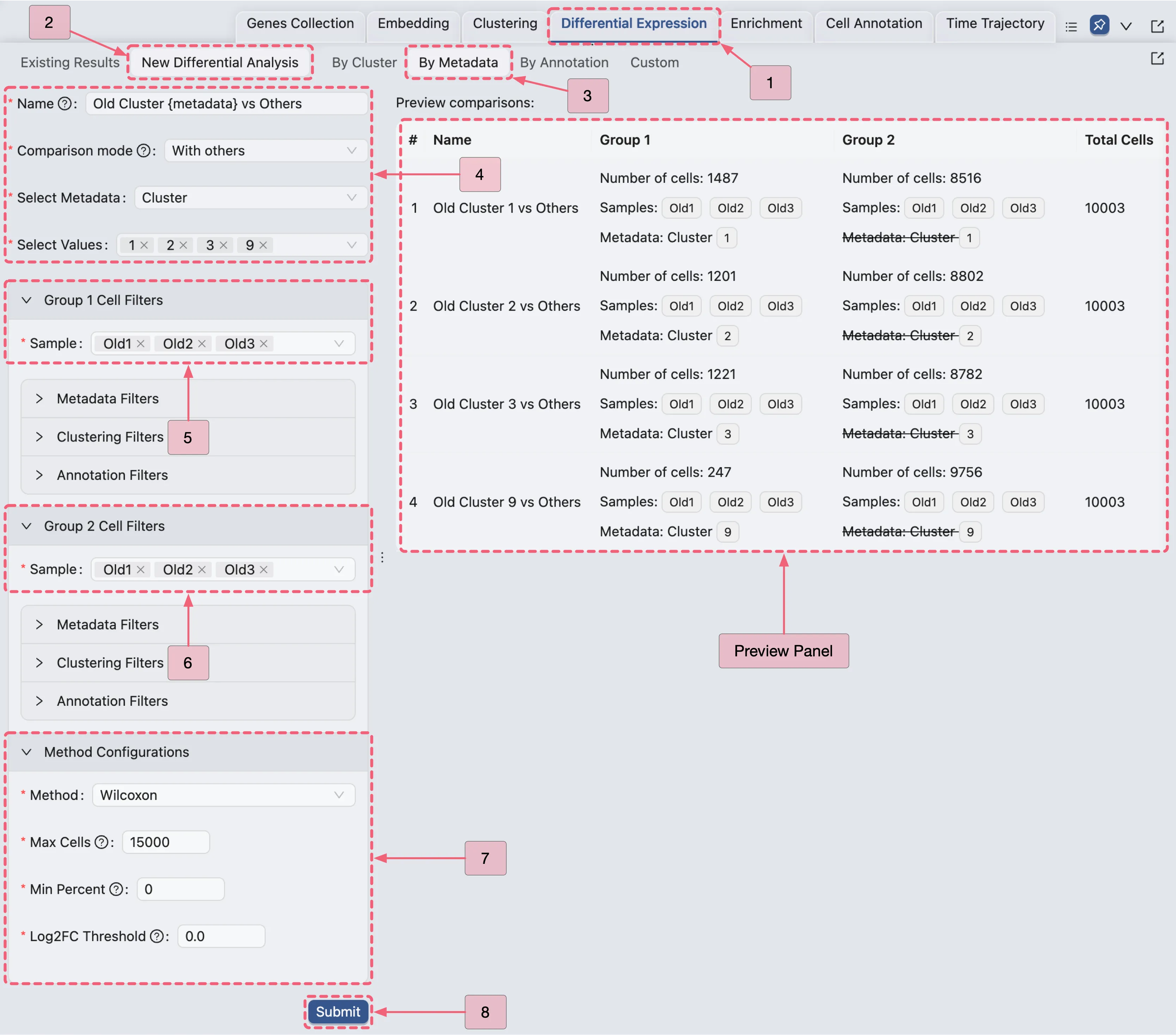 With others- Specifies the comparison strategy, indicating that the selected group versus all other groups within the chosen category. In this study, we will compare each cluster in theClustermetadata column against all other clusters.Select Metadata: