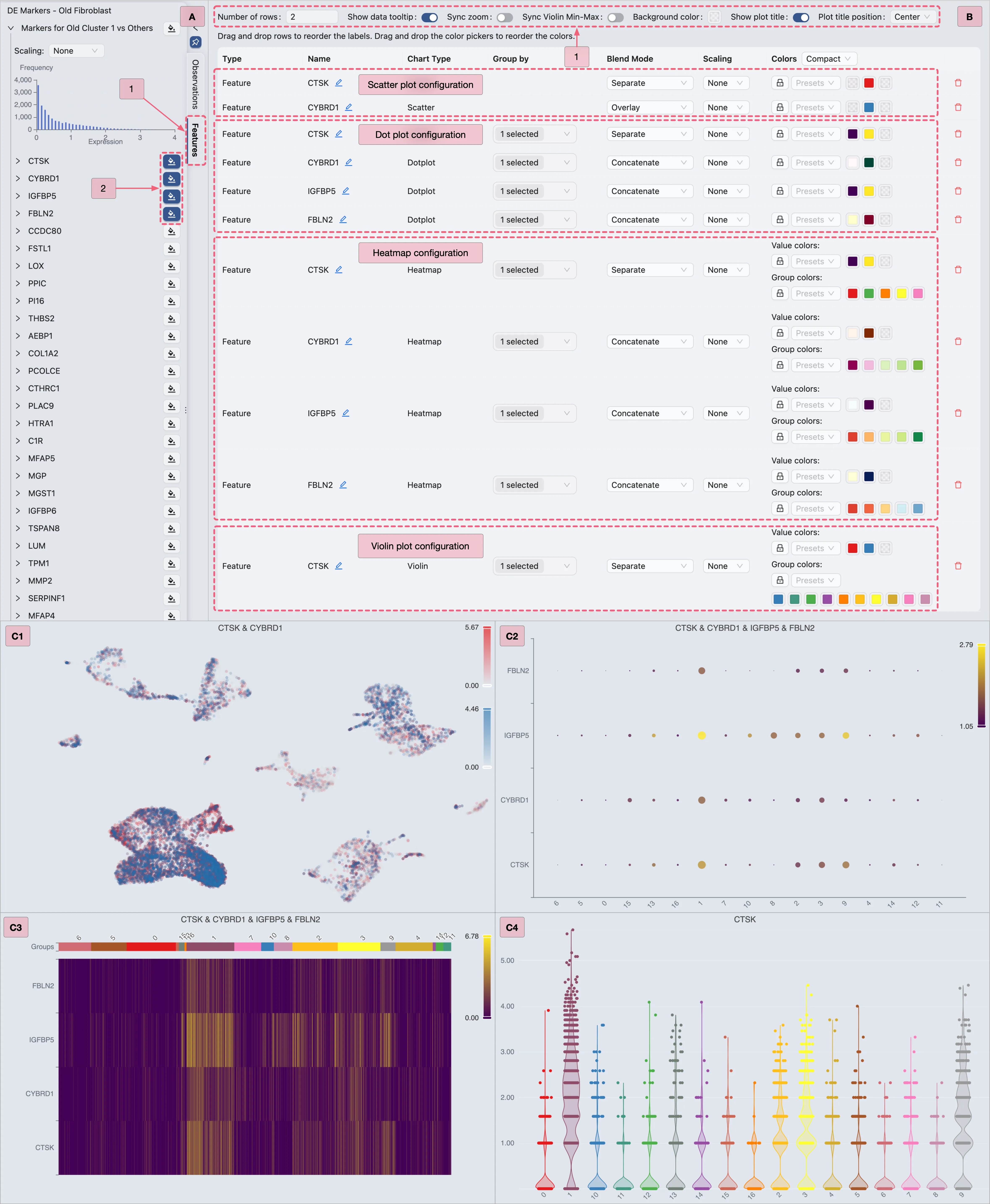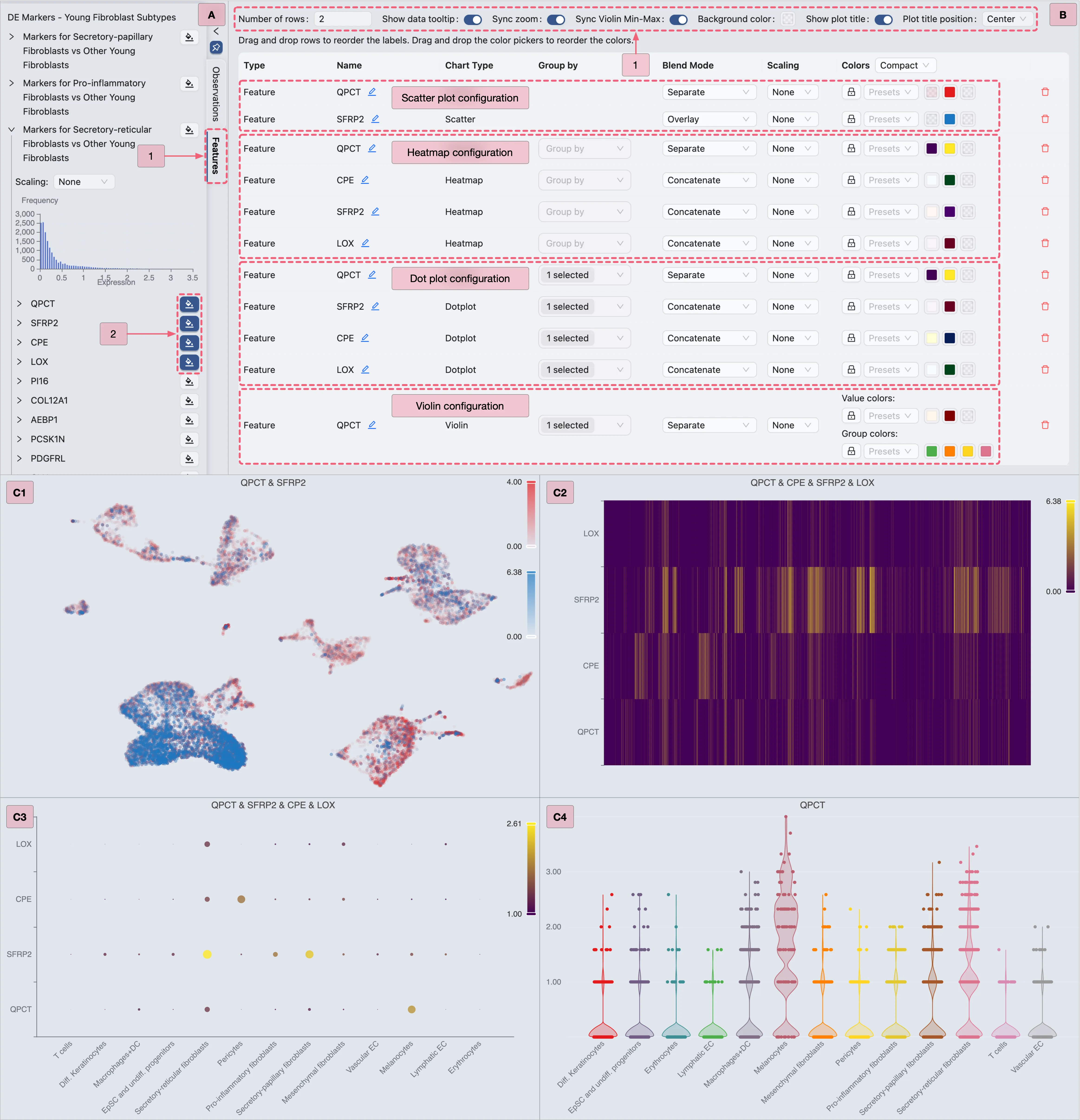 Sync Violin Min-Maxoption to standardize value ranges across plots.C: Review the finalized violin plot results.