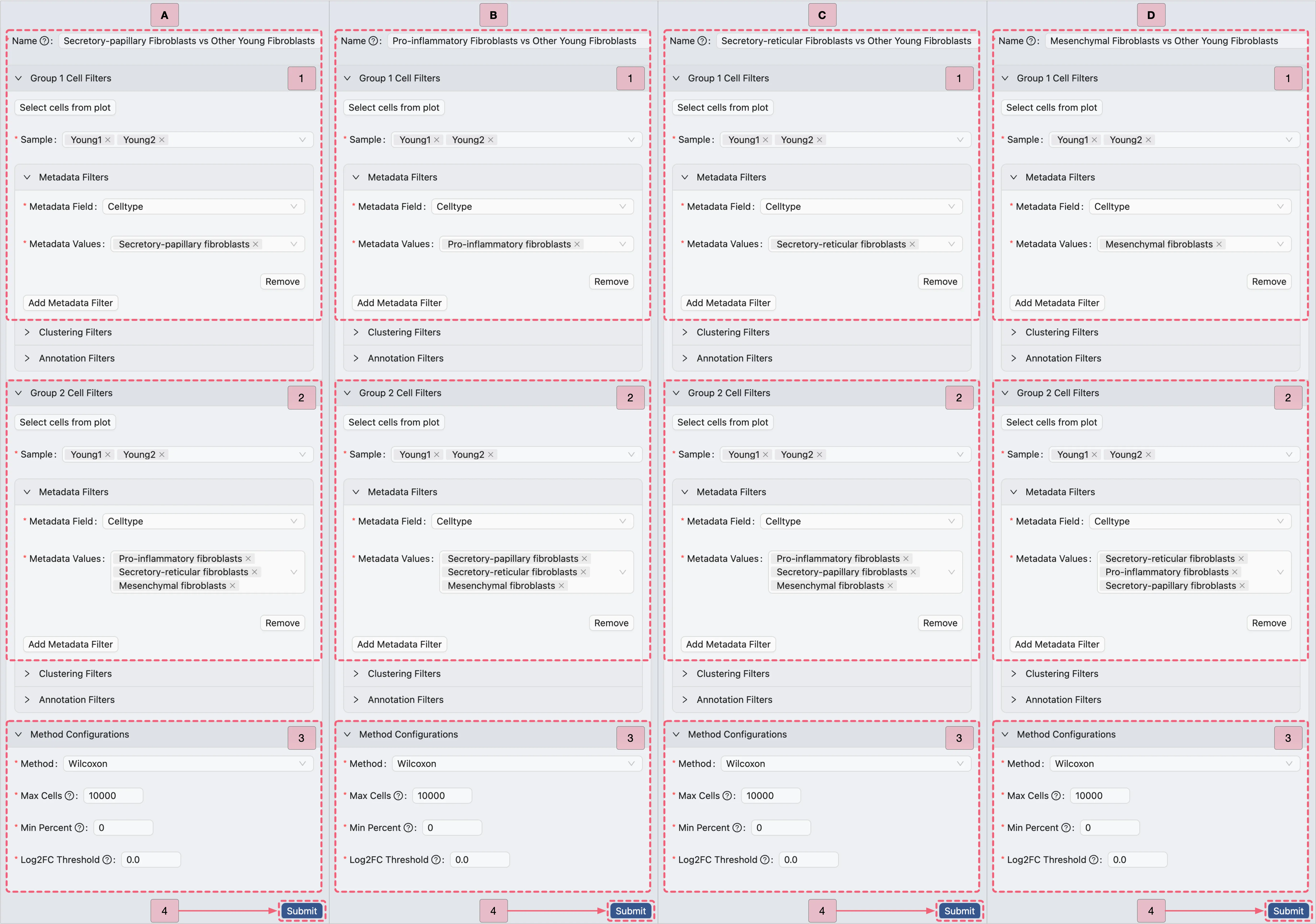 Group 1 Cell FiltersandGroup 2 Cell Filters: Specify the cell filters for each group.Method Configurations: Choose the method for the analysis and define its parameters.