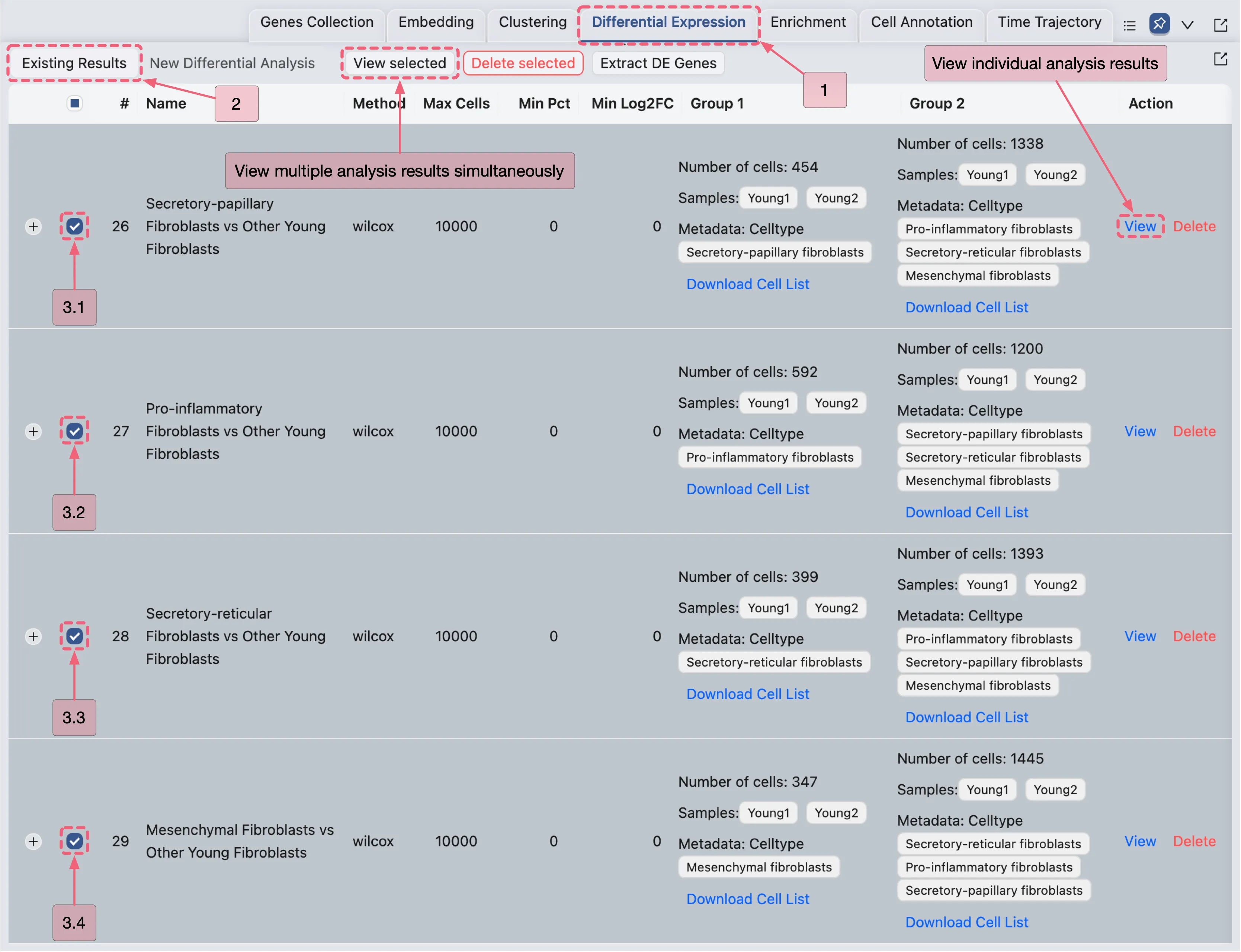 Differential Expressionpanel.Follow the steps depicted in the image below to extract significant DE genes: