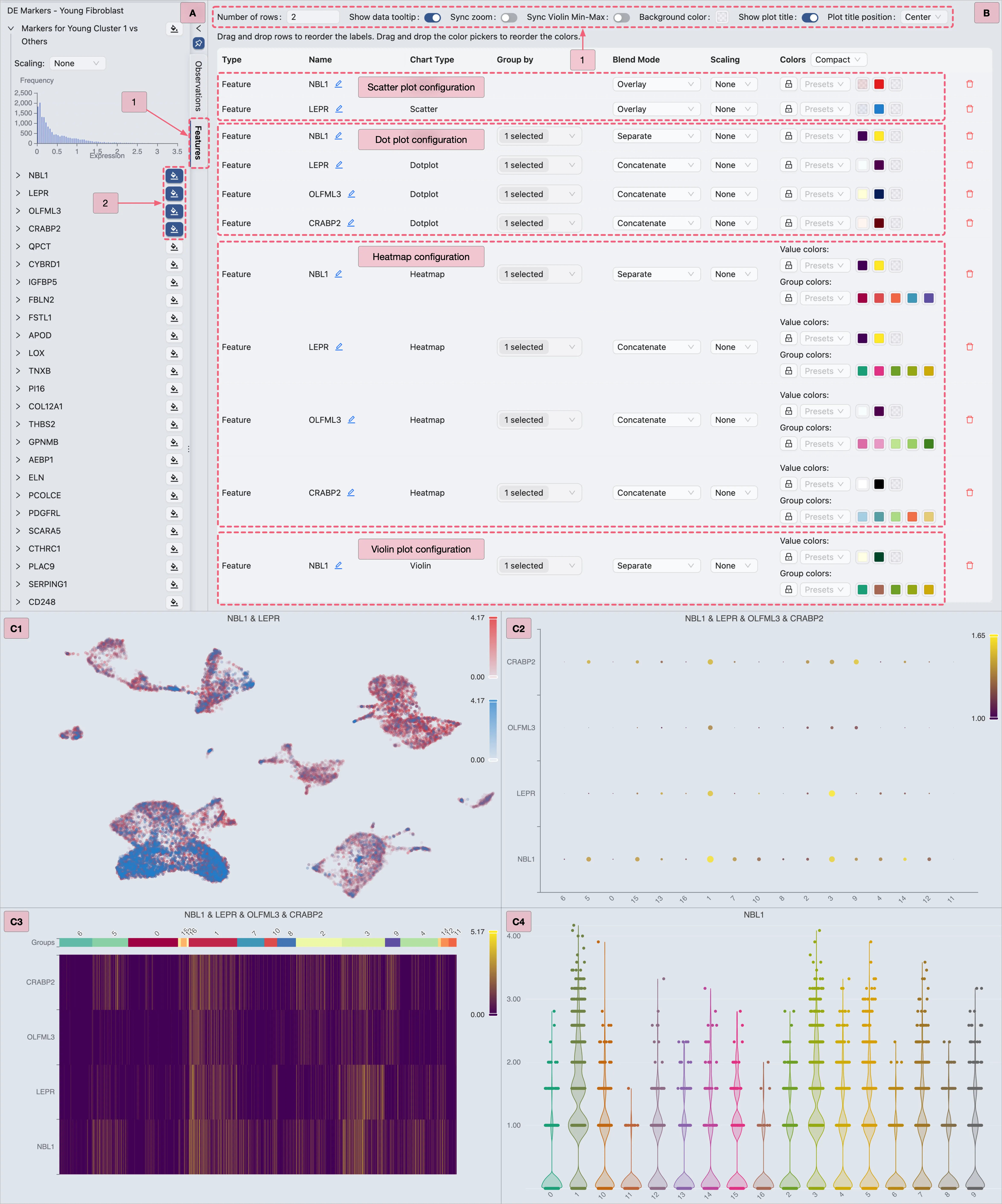 Markers for Secretory-reticular Fibroblasts vs Other Young Fibroblastsgene set to view its marker genes.For each chart type: