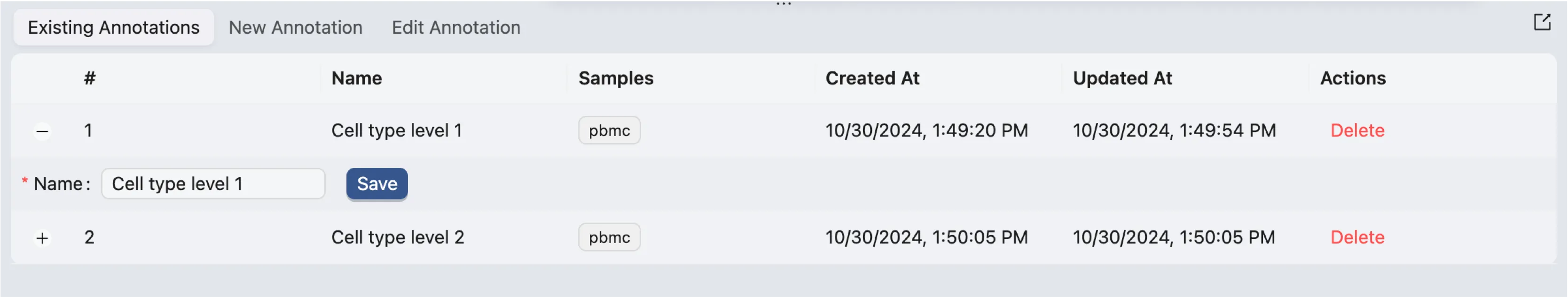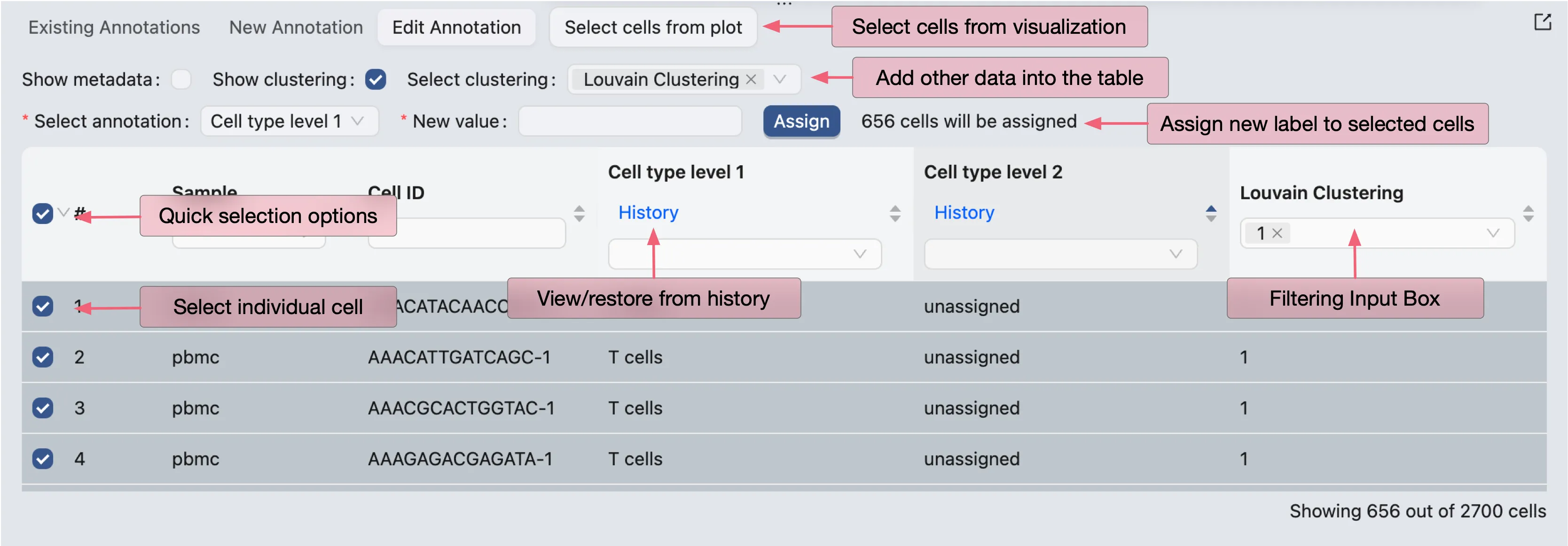 To assign a new value to a cell or a group of cells, check the checkboxes in the first column of the cell rows. A new form will appear at the top of the table where you can select the annotation you want to edit and assign a new value to it.