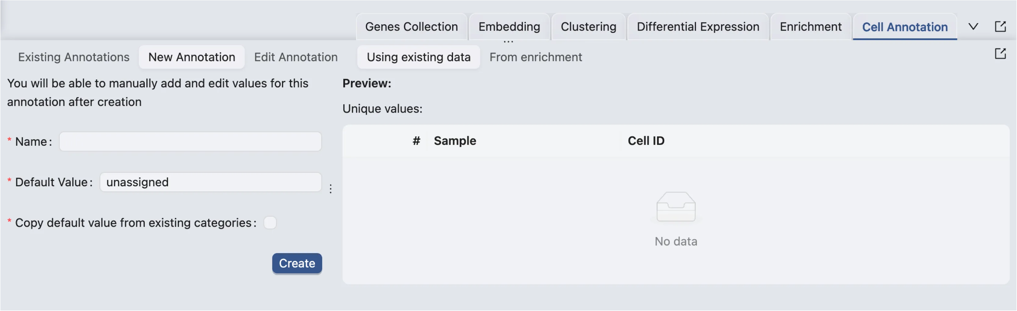 Default Value: Enter a default value for the new annotation. This value will be assigned to all cells by default or when there is missing data.