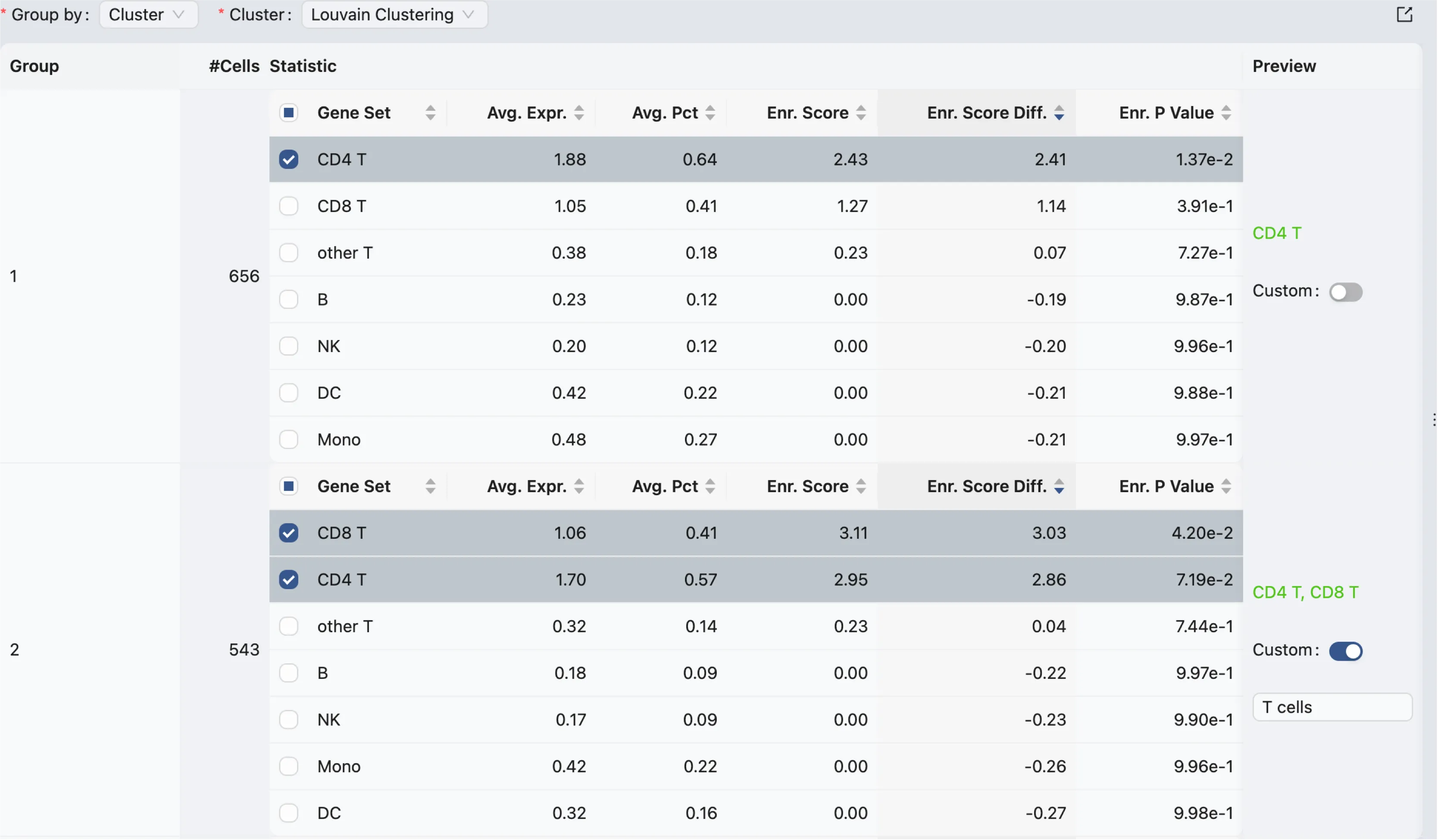 The statistics section allows you to group cells based on existing clusters, metadata, or annotations. It then calculates the enrichment of gene sets in each group of cells and displays the results in a table.