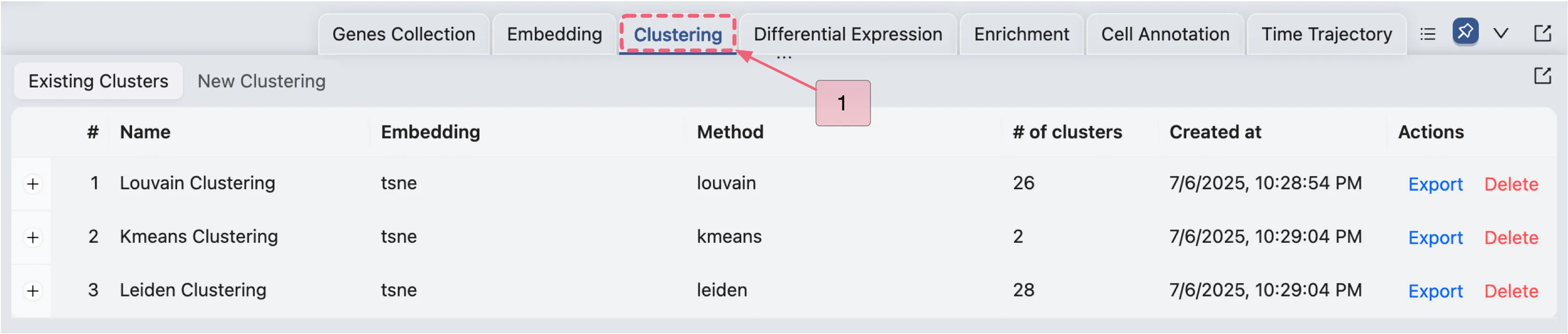 On the existing clustering table, you can see all the clustering analyses you have performed. To view the details of a specific clustering analysis, click the