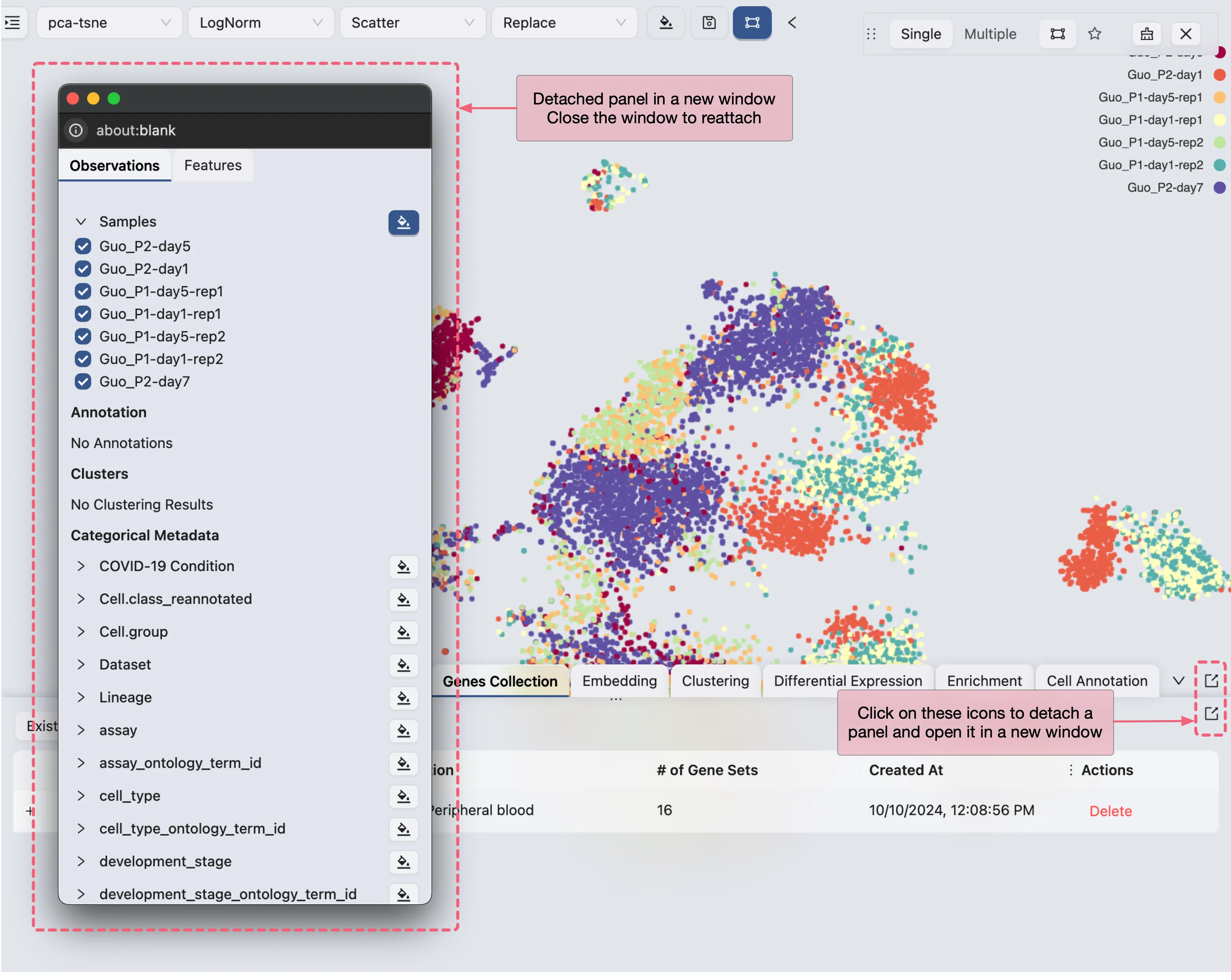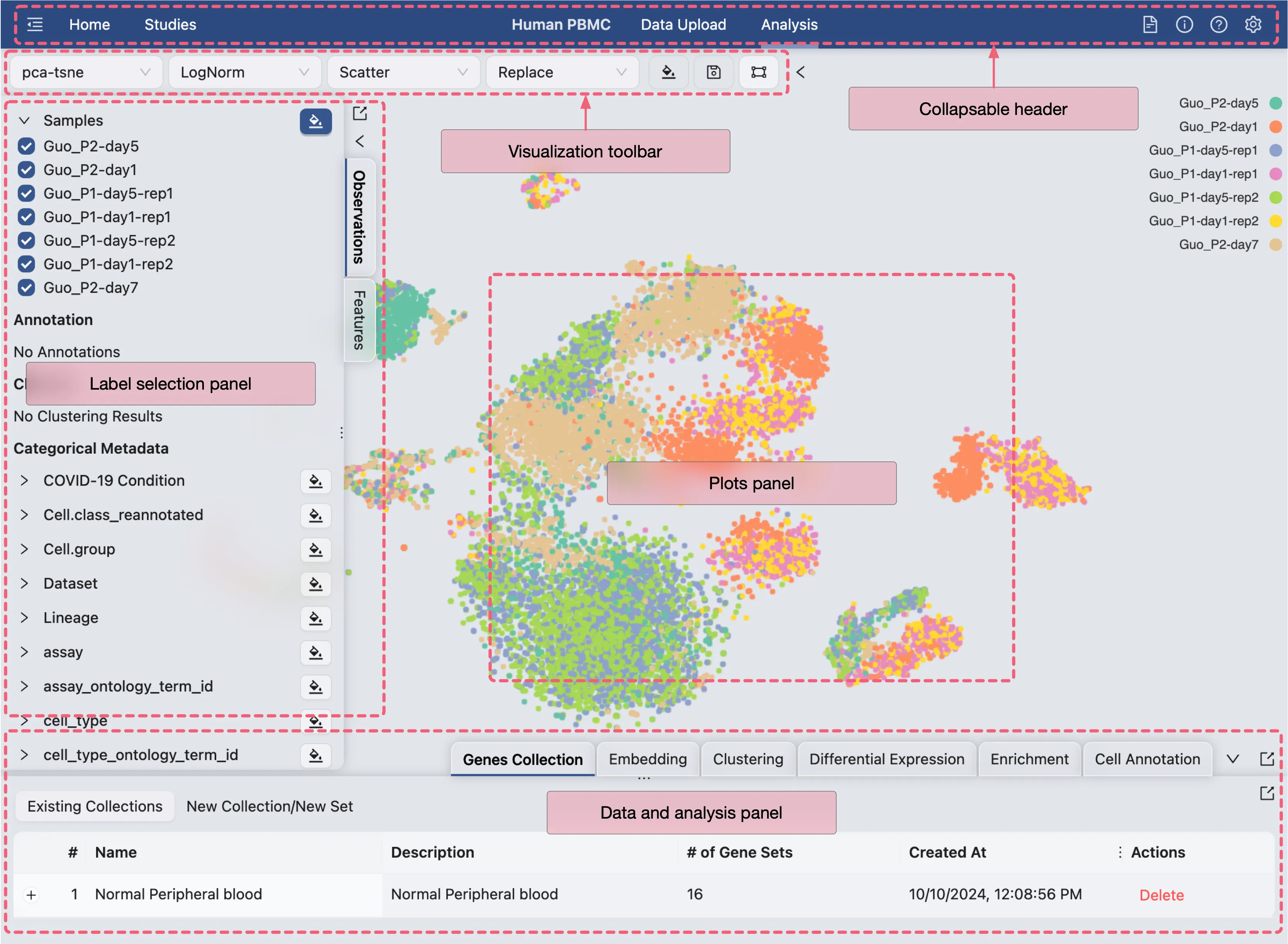 (top left corner) button.Visualization toolbar: Contains tools for data visualization, such as embedding selection, normalization, chart type, color mapping, save and load visualization state, and more.Label selection panel: Allows you to select the labels to be displayed on the visualization.Plots panel: Displays the data visualization plots.Data and analysis panel: Contains the data table and analysis tools and methods.