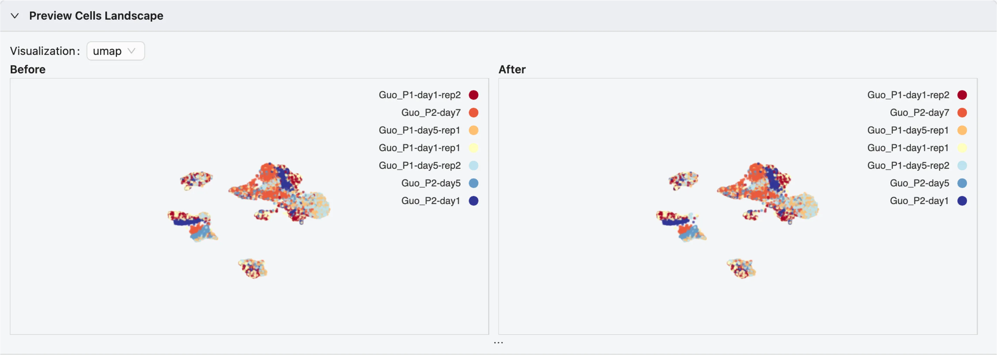 If your data contains precomputed embeddings and you have selected to keep them, the preview will display the cells in the 2D embedding space.