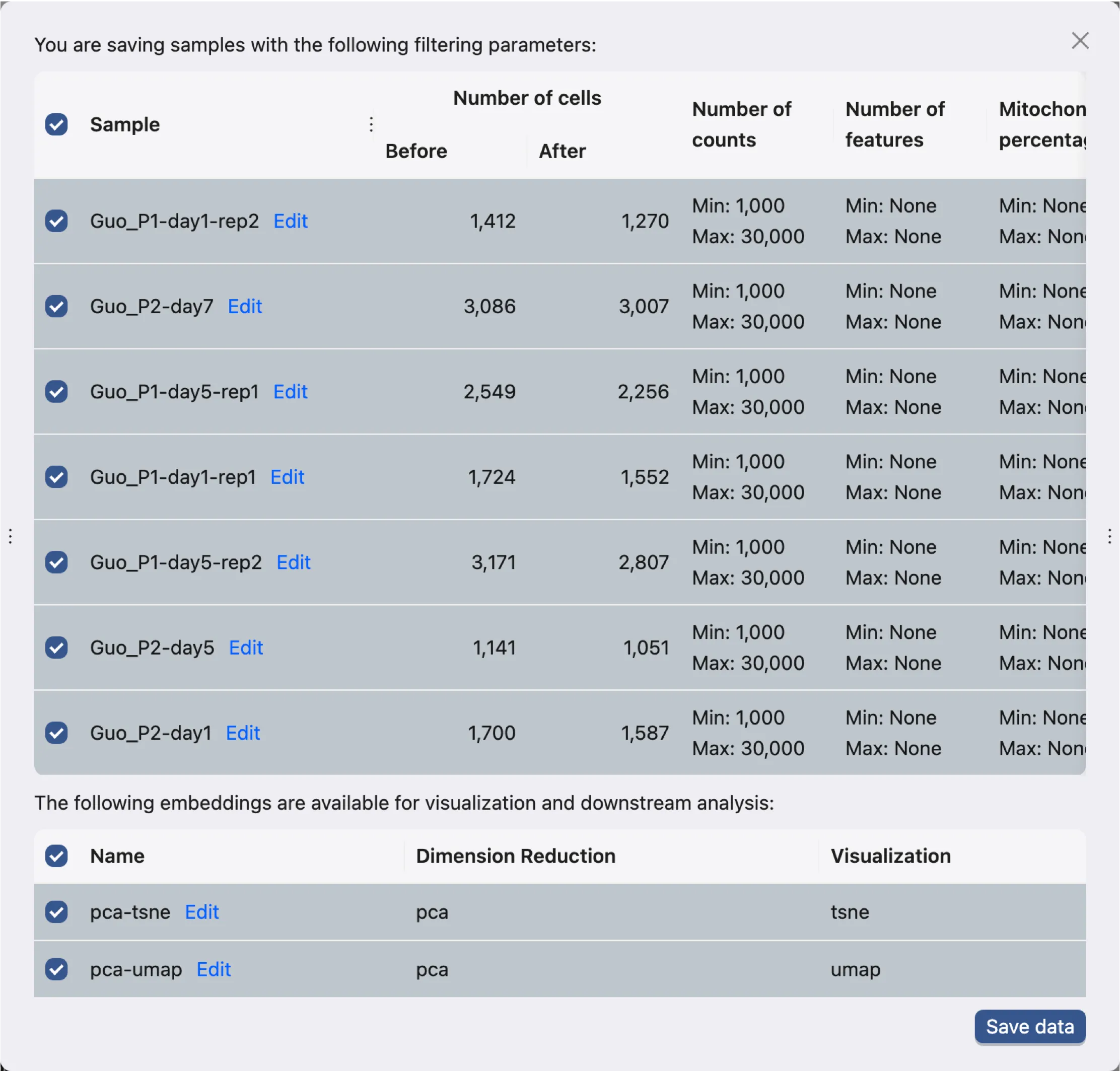 The dialog will ask you to enter a name for the export file and select metadata, embeddings, clustering results, and annotations to include in the export.