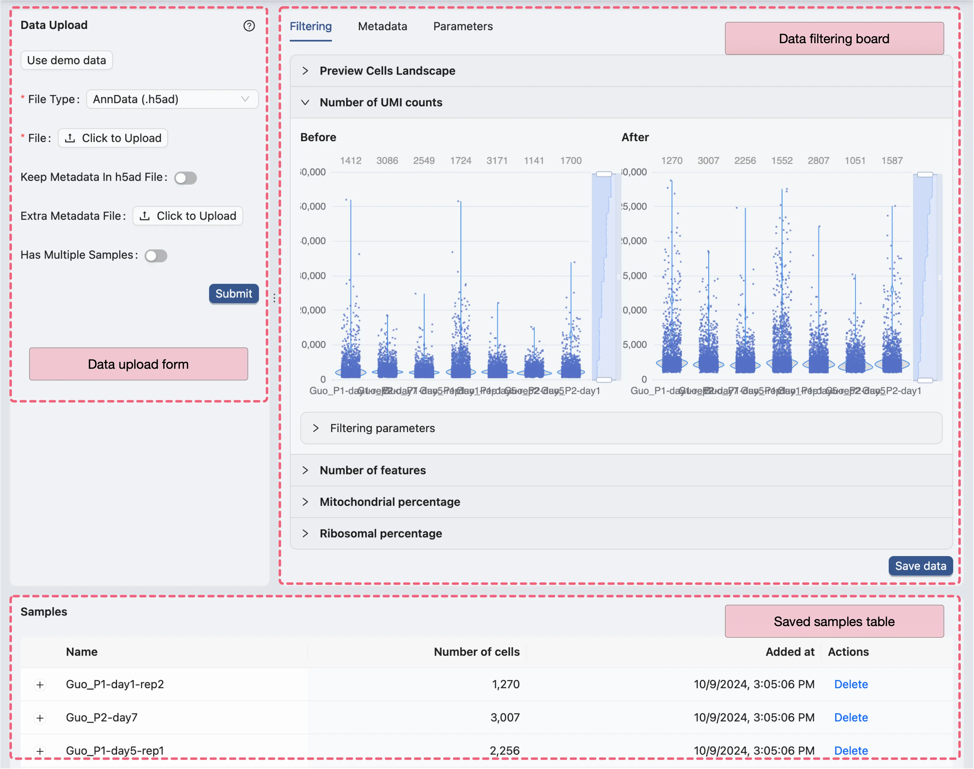 Data Upload Form: The form to upload data files and select processing options.Data Filtering: The panel to preview the data and filter cells based on different criteria.Samples Table: A table to display all samples uploaded in the study.