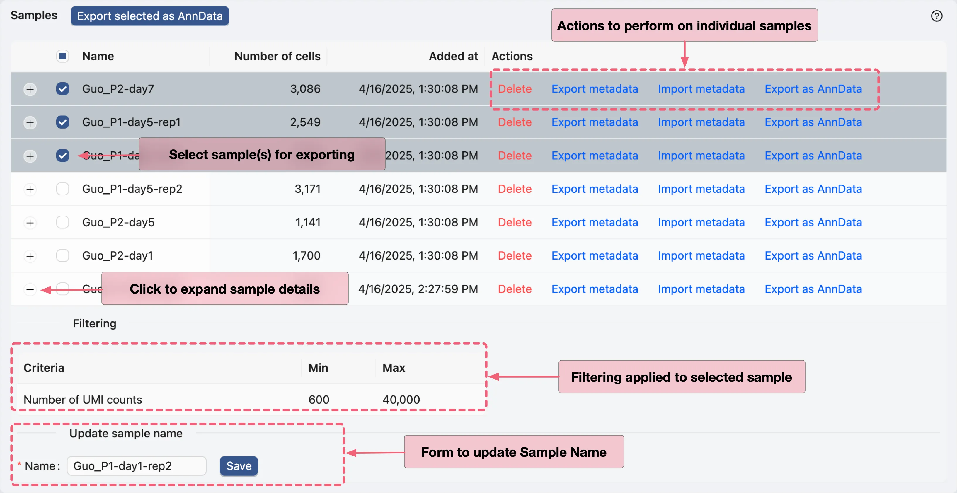 Delete: Permanently delete the sample and associated data.Export metadata: Export the metadata of the sample incsvformat.Import metadata: Import a new metadata file for the sample.Export as AnnData: Export the sample as anAnnDatafile.