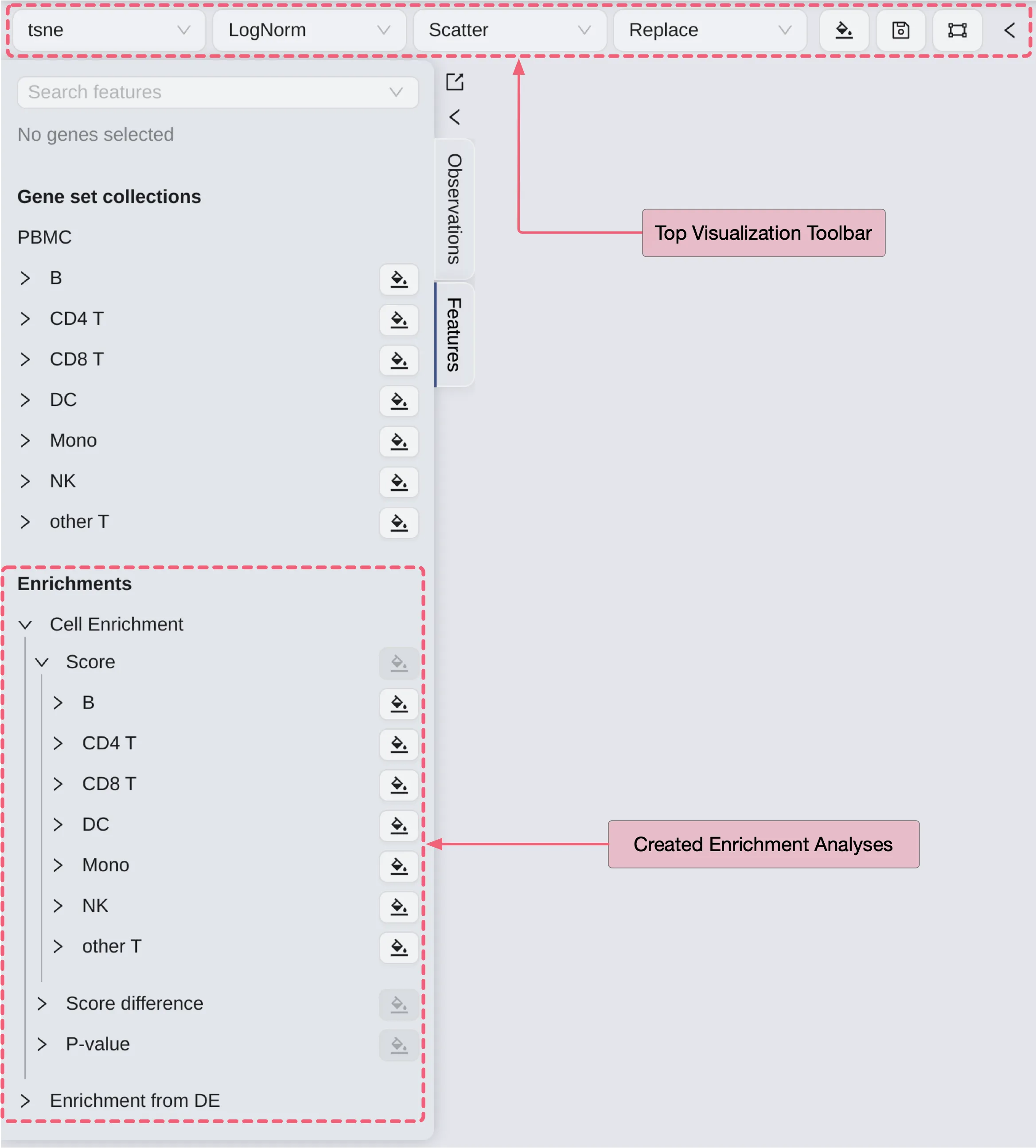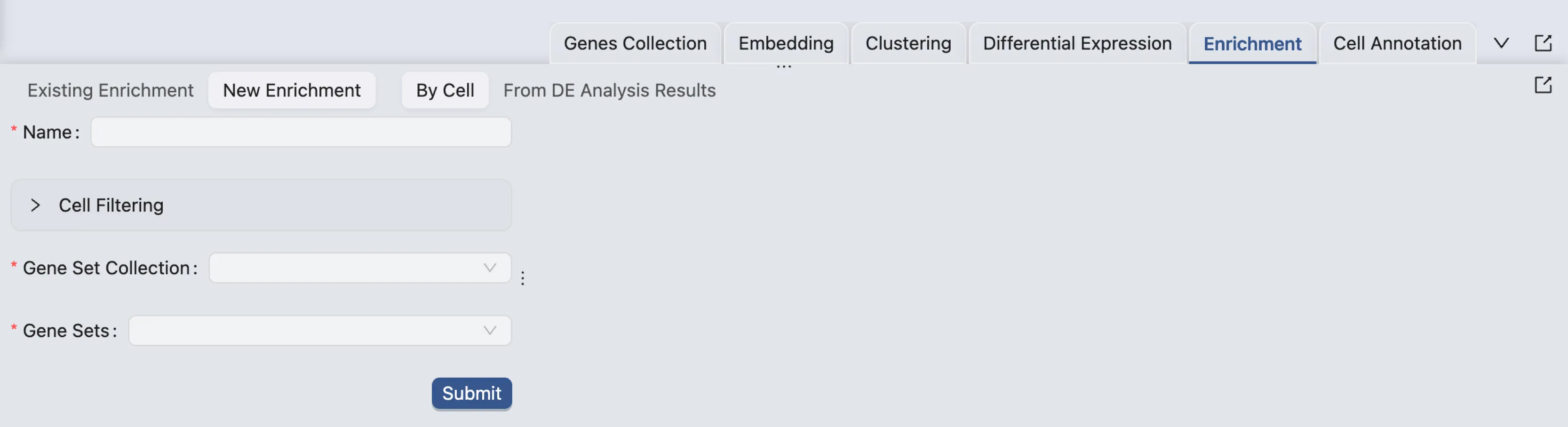 By Cell enrichment analysis is used to perform enrichment analysis on individual cells. It is useful when you want to have an overlook of the difference between gene sets in individual cells, or when you want to see how the genes in a gene set progress across cell landscape. See Visualize Created Enrichment Analyses to see an example of how individual cells are enriched.