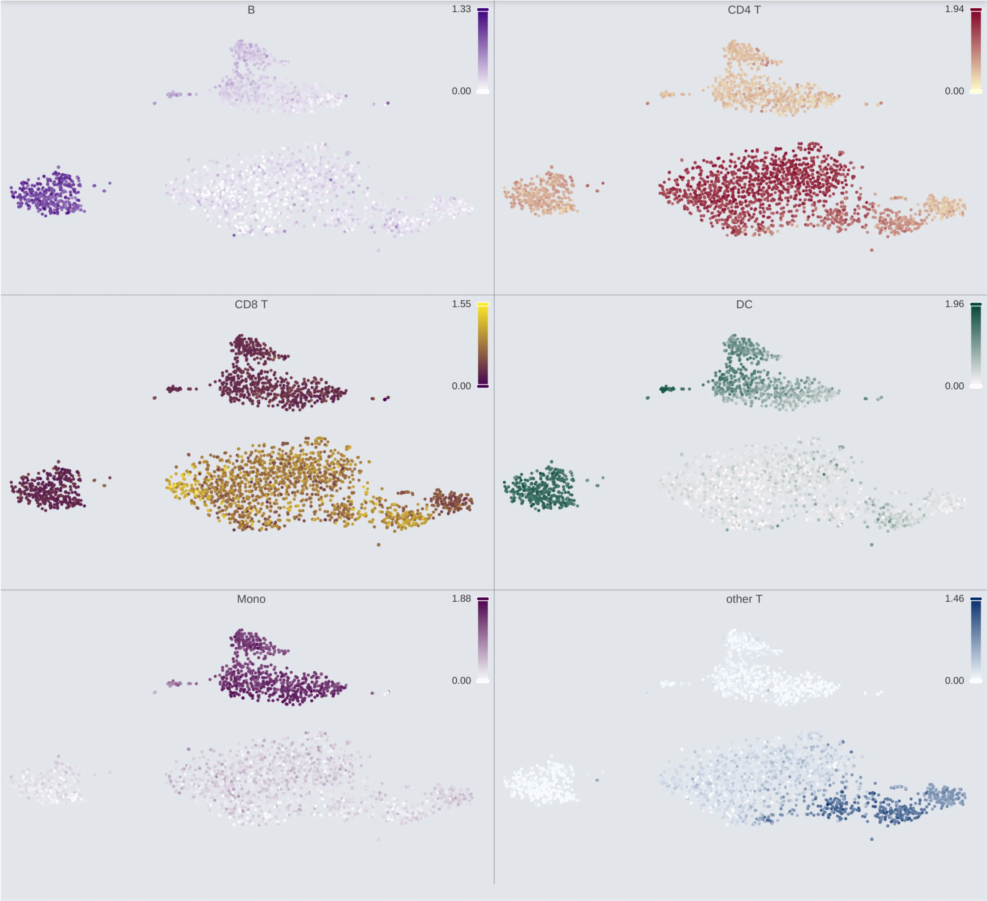 For example, the following visualization shows the by-cell enrichment score of the gene sets.