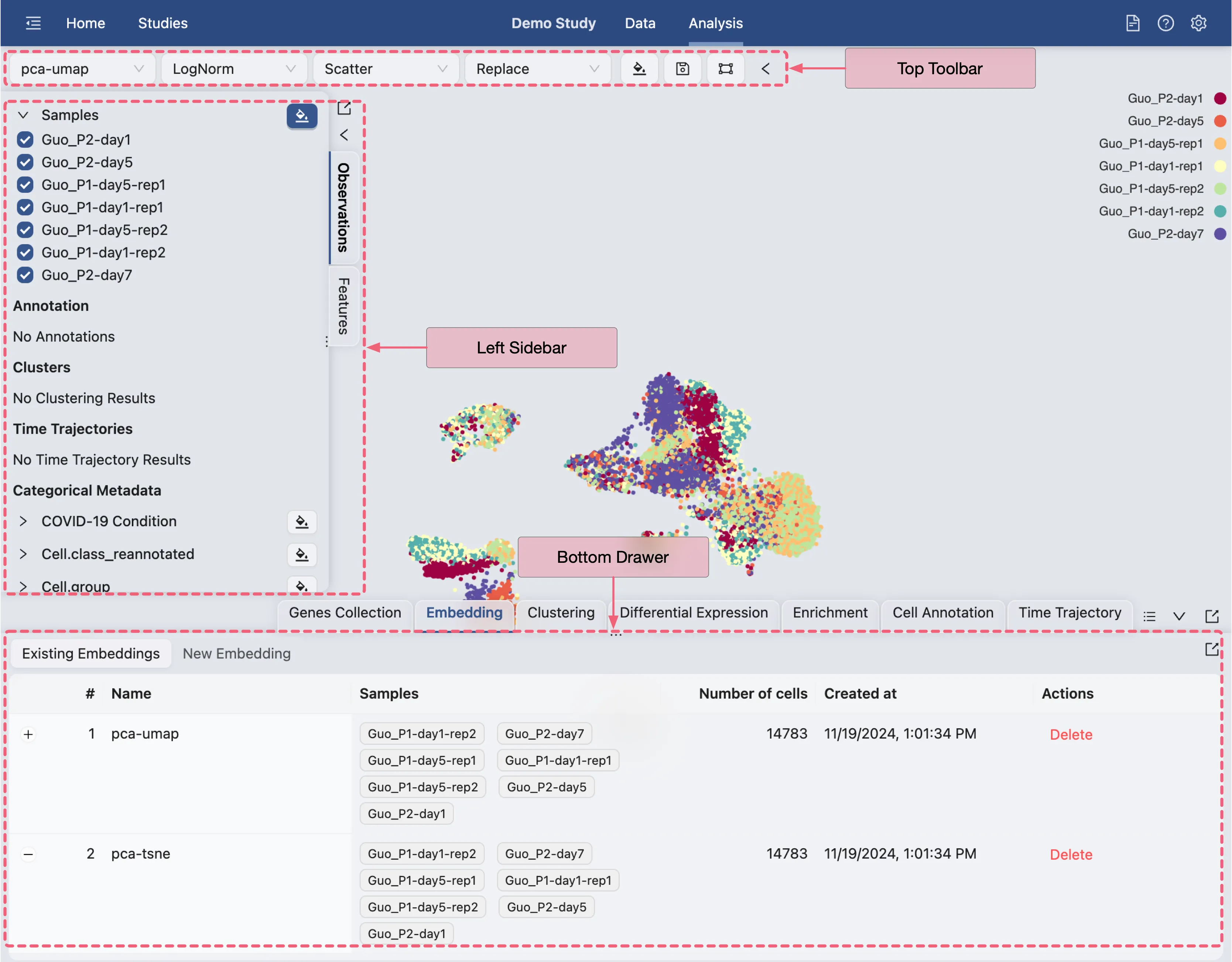 iSCanGuide will create a job to create the new embedding. Once the job is completed, the new embedding will be added to the Embedding Table. This embedding can also be used for visualization in the Top Toolbar.