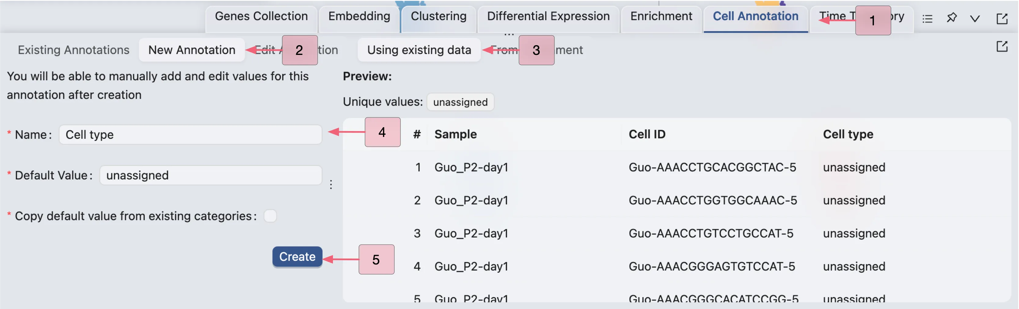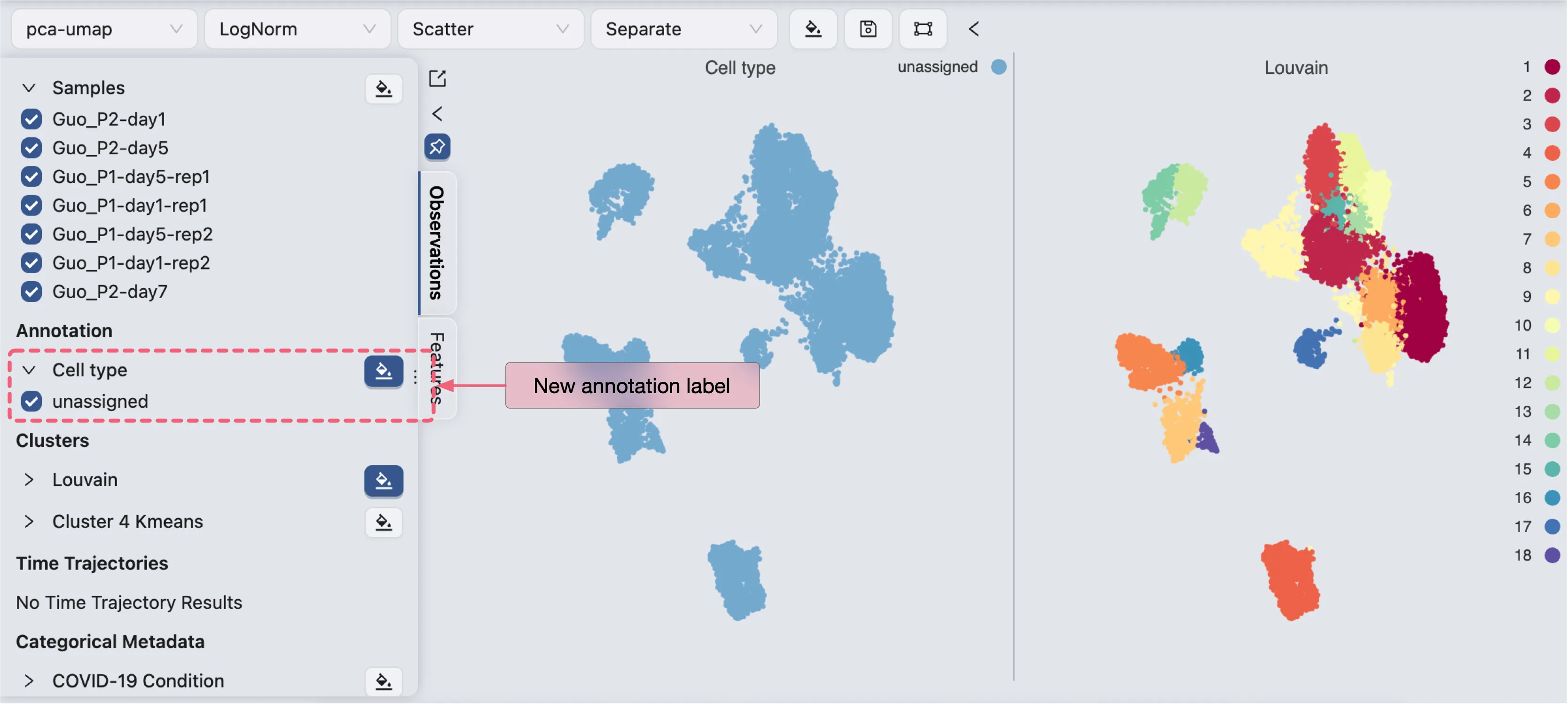 iSCanGuide allows you to copy values from existing labels to the new annotation label, as well as create annotation by aggregating enrichment results. Check out Cell Annotation for more details. In this tutorial, we will create a new annotation label with all values set to unassigned, and then manually annotate cells.