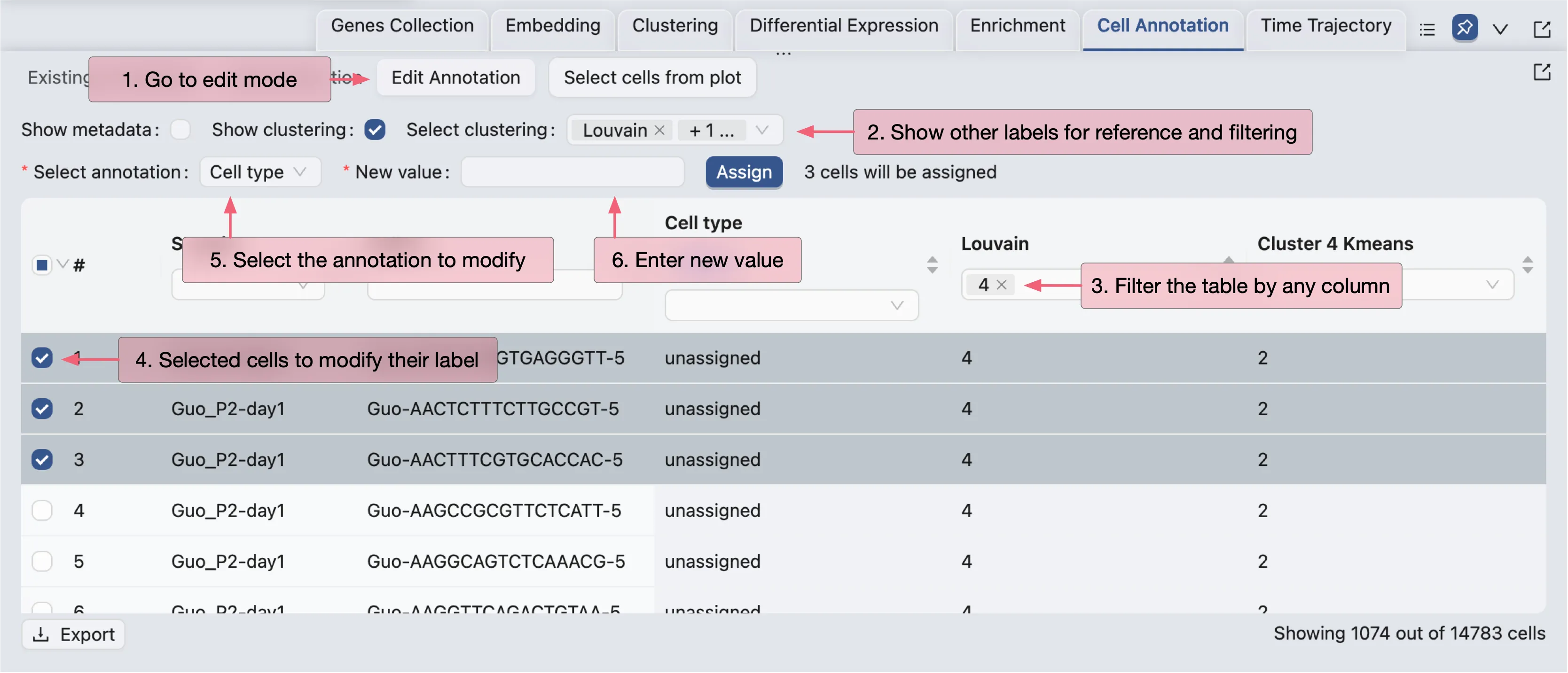 To annotate cells, click on the Edit Annotation button in the Cell Annotation panel. In the annotation editor, you can: