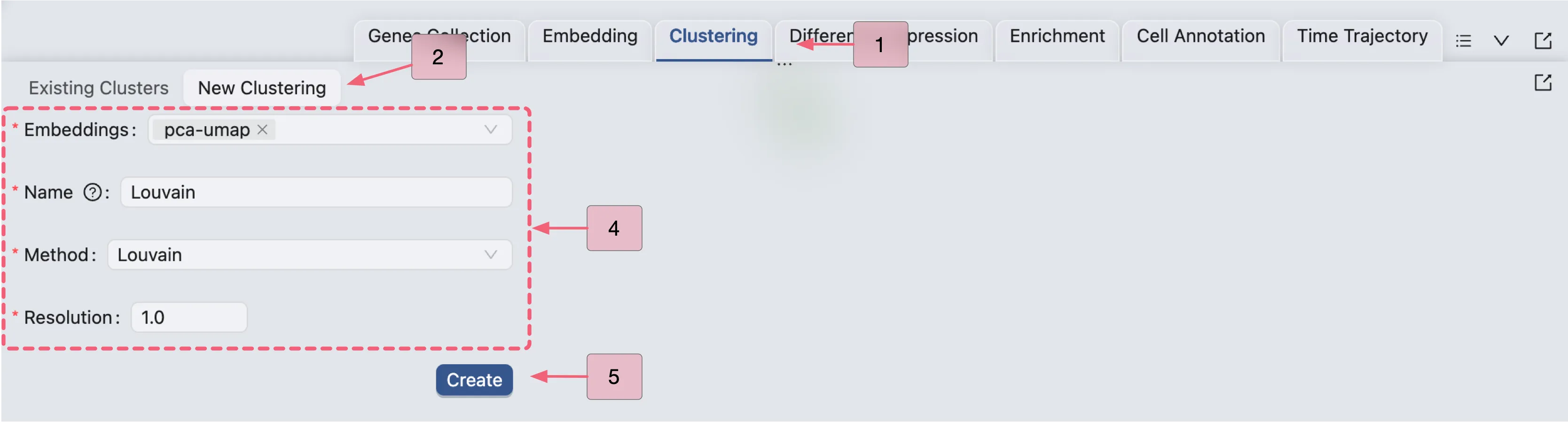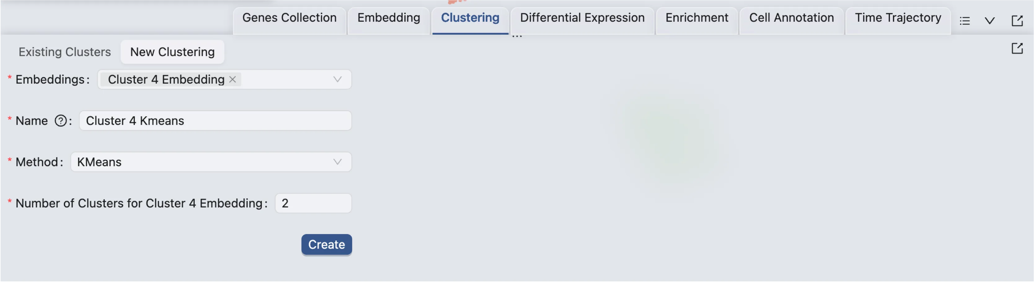 Click Create to start the clustering analysis. Once the job is completed, the clustering results will be added to the Clustering Table and ready for visualization in the Left Sidebar.