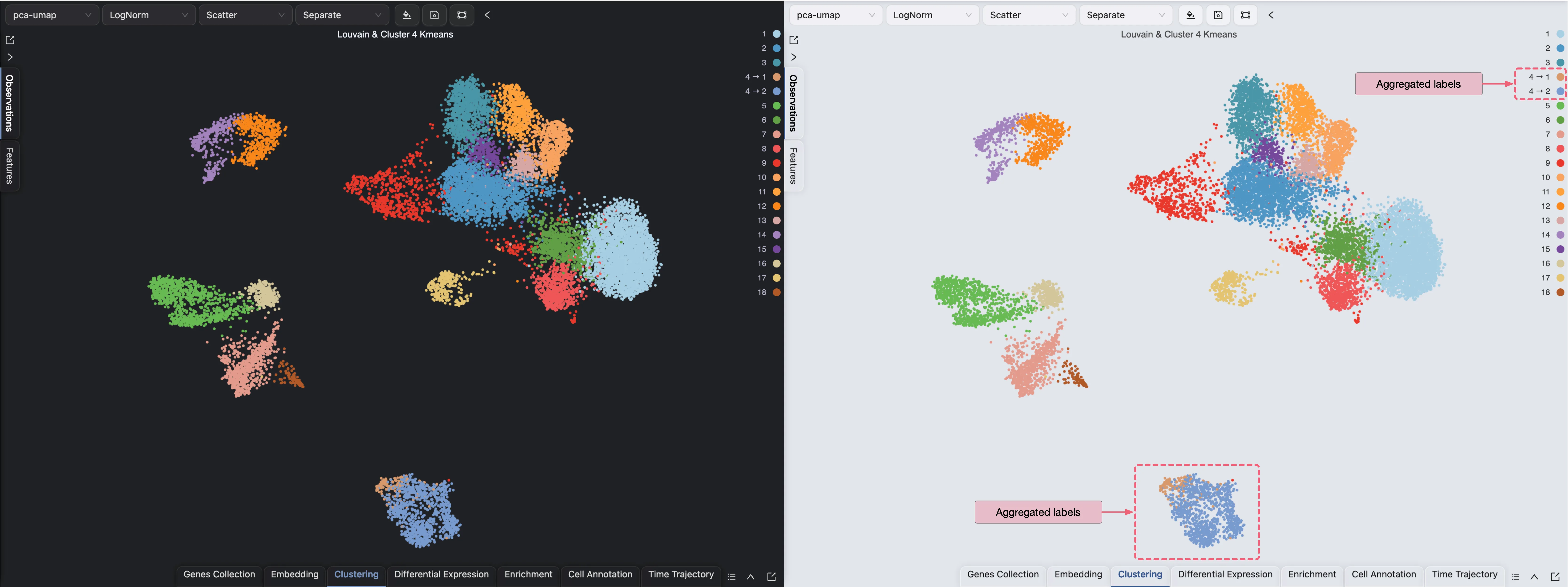 This visualization shows the clustering and sub-clustering results side by side. In iSCanGuide, you can aggregate multiple labels in a single plot by using the Blending mode.