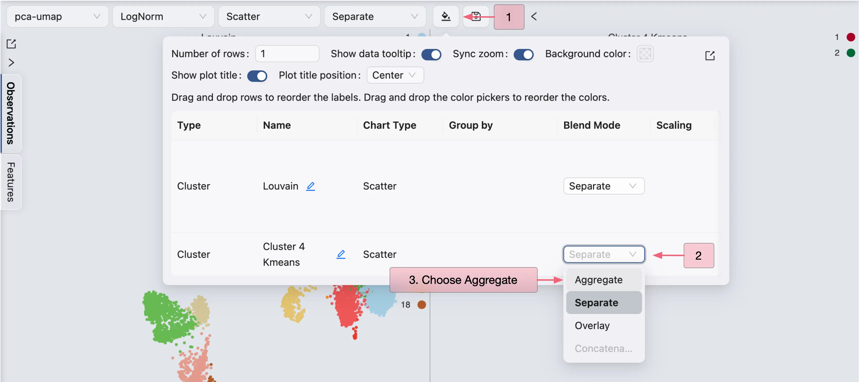 First, change the Blending mode to Separate in the Top Toolbar so that each cluster is visualized separately. Next, select the clustering and sub-clustering results in the Left Sidebar to visualize them.