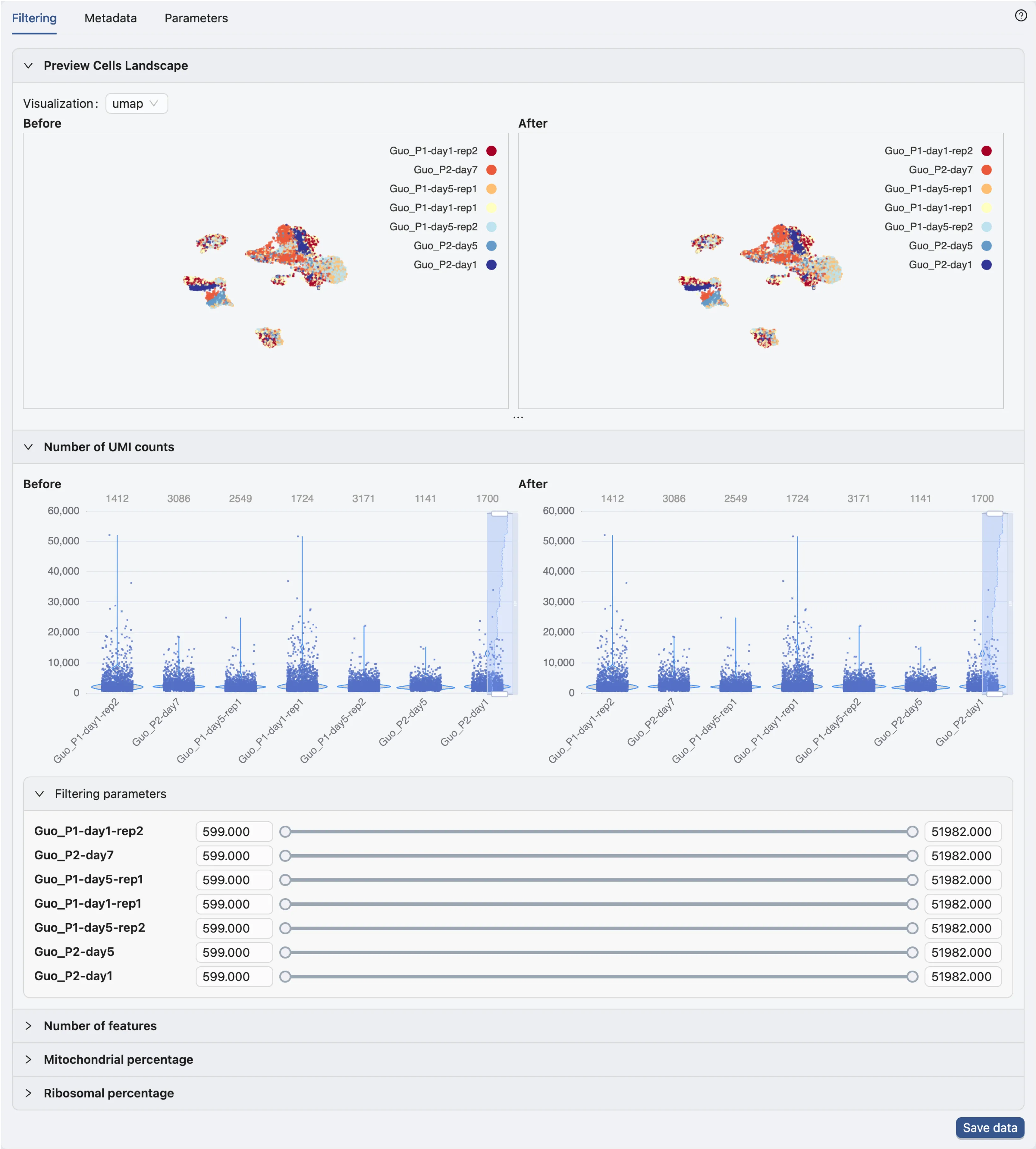 In the data filtering panel, you can filter cells based on different criteria, including the number of UMI counts, the number of genes expressed, and the percentage of mitochondrial genes.