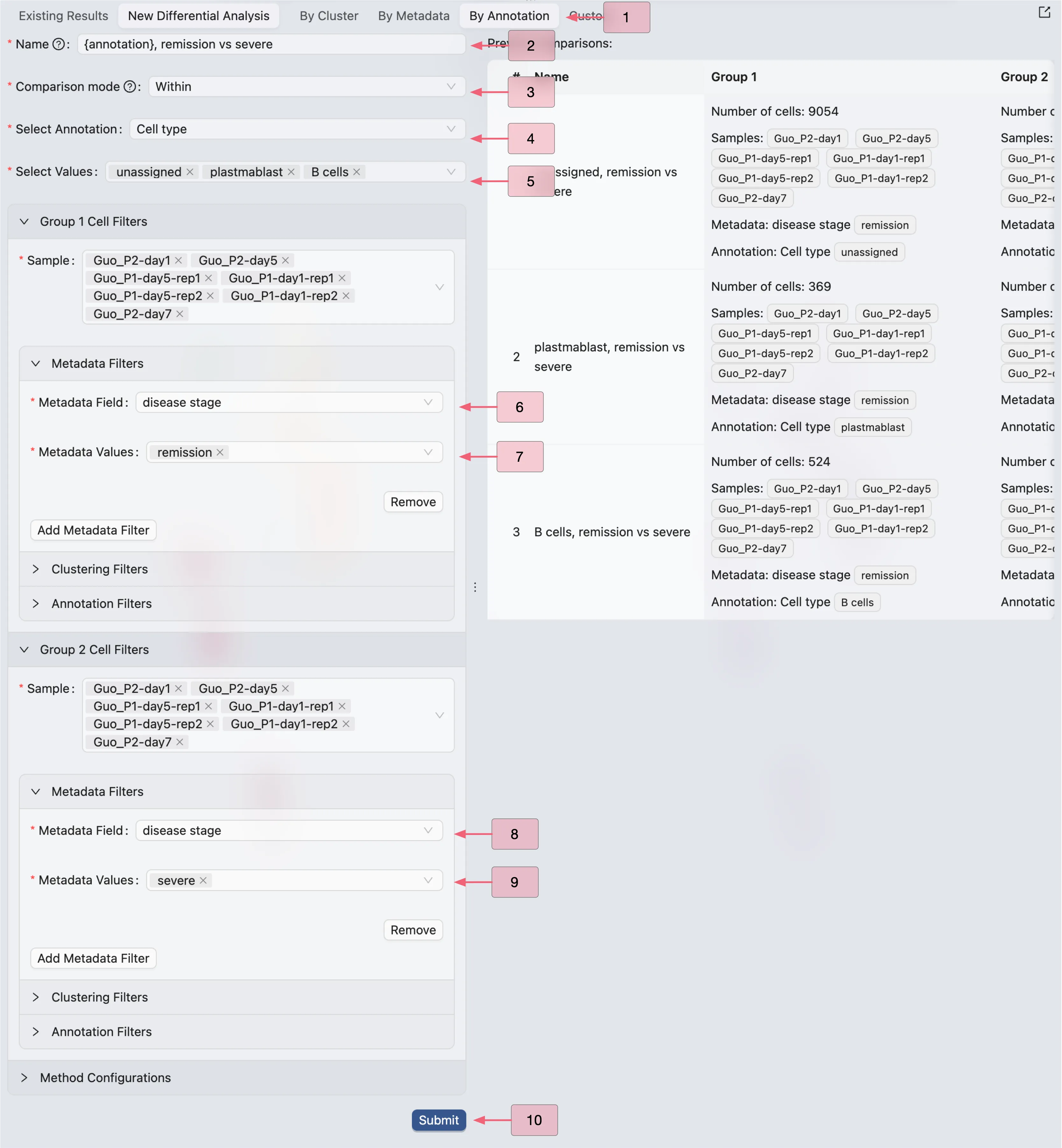 disease stageas the metadata field for filtering cell in Group 2Select
