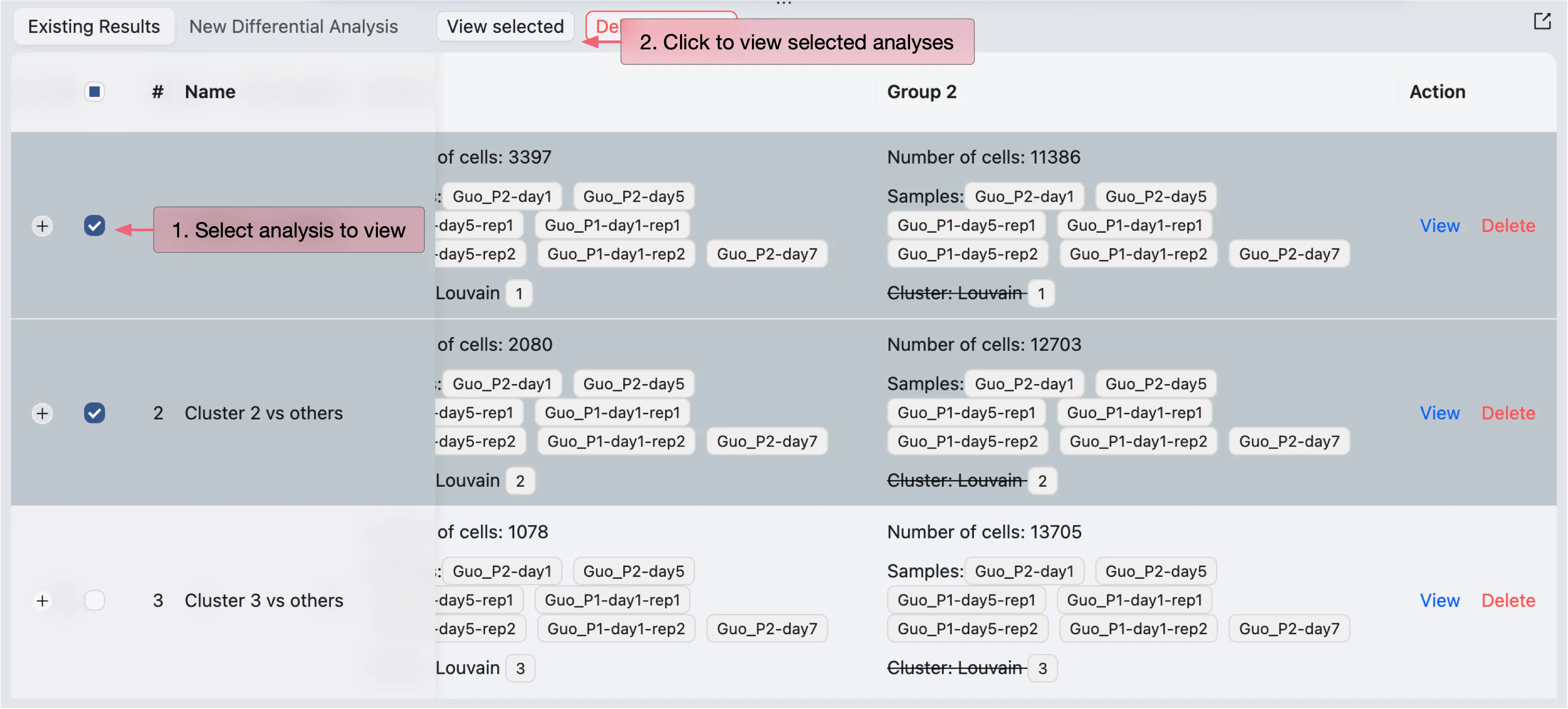 iSCanGuide allows you to view and visualize multiple DE results at once. To visualize the DE results, simply select the results you want to visualize in the table then click on the View selected button.