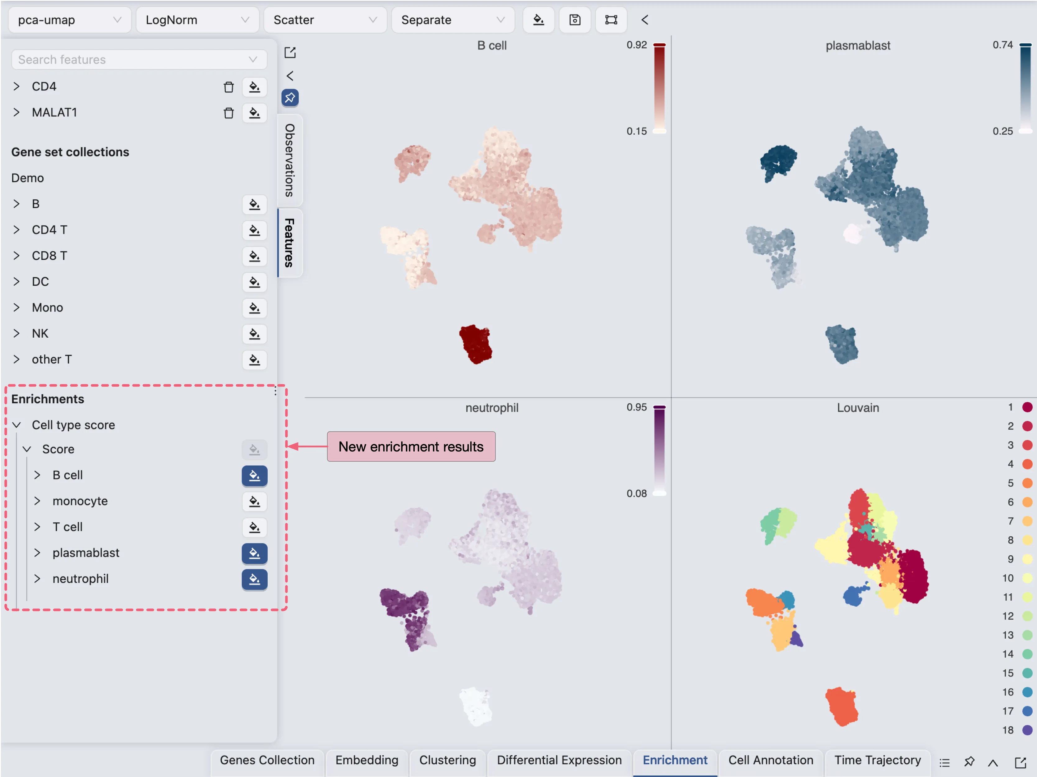 iSCanGuide provides multiple tools for enriching cells to help with cell annotation. You can enrich cells using genes from gene set collections, differentially expressed genes, or using pretrained models to calculate cell type scores.