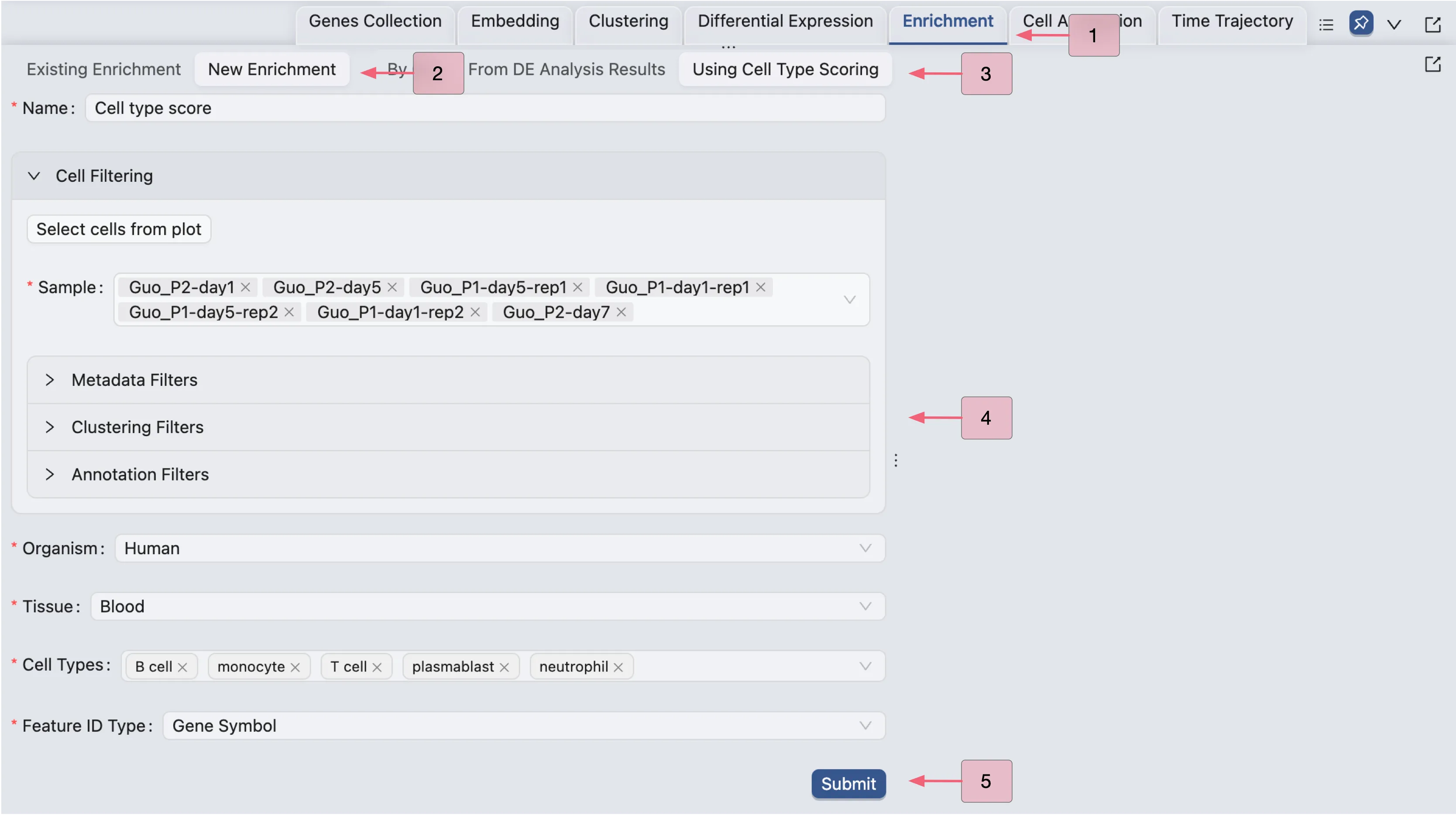 Using Cell Type Scoringbutton.Fill in the required fields, such as the name of the enrichment analysis, organism, and cell types.