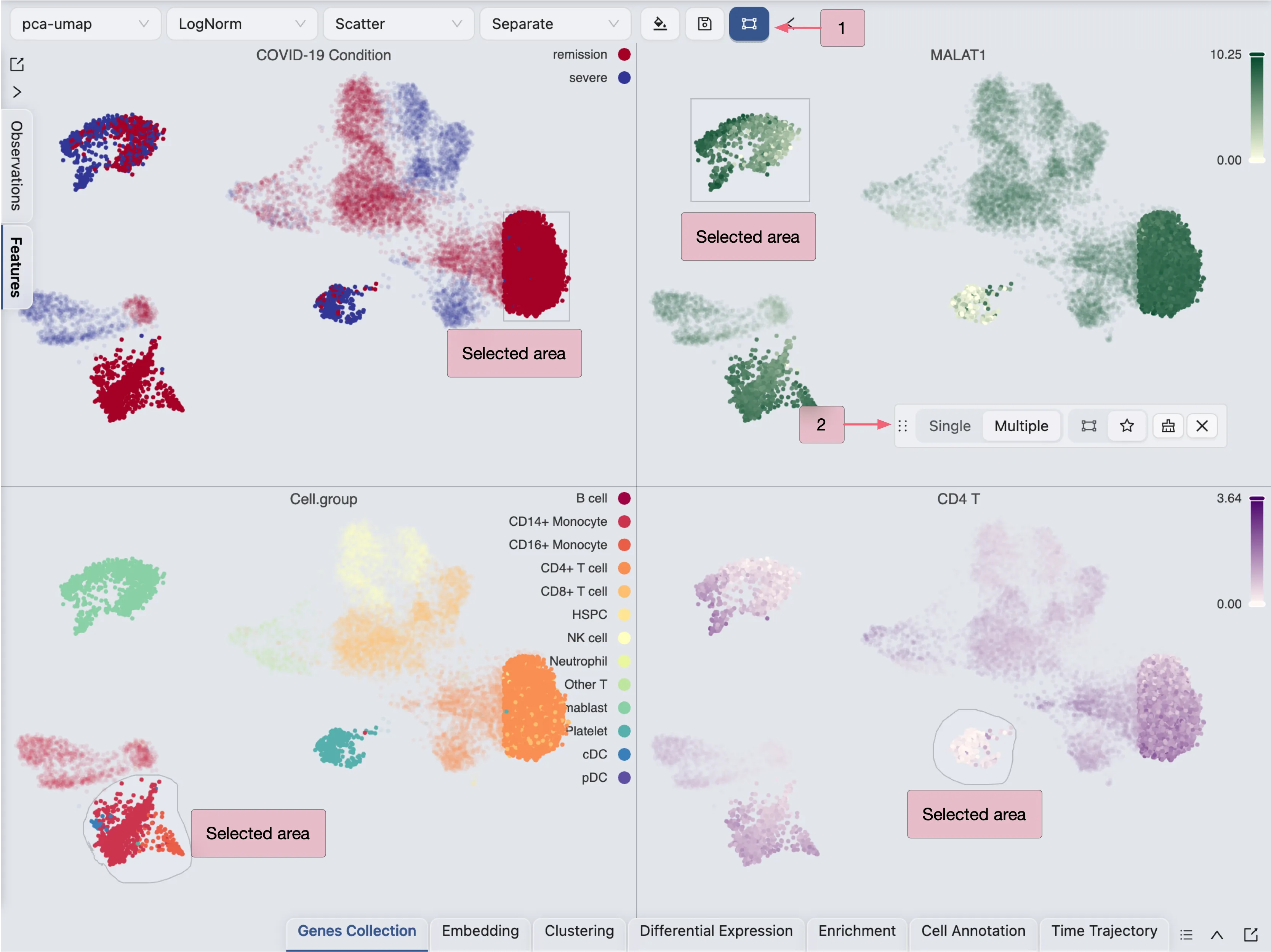 The selection tool is useful when you need to filter cells for cell annotation, create a new embedding, perform differential expression analysis, and more.