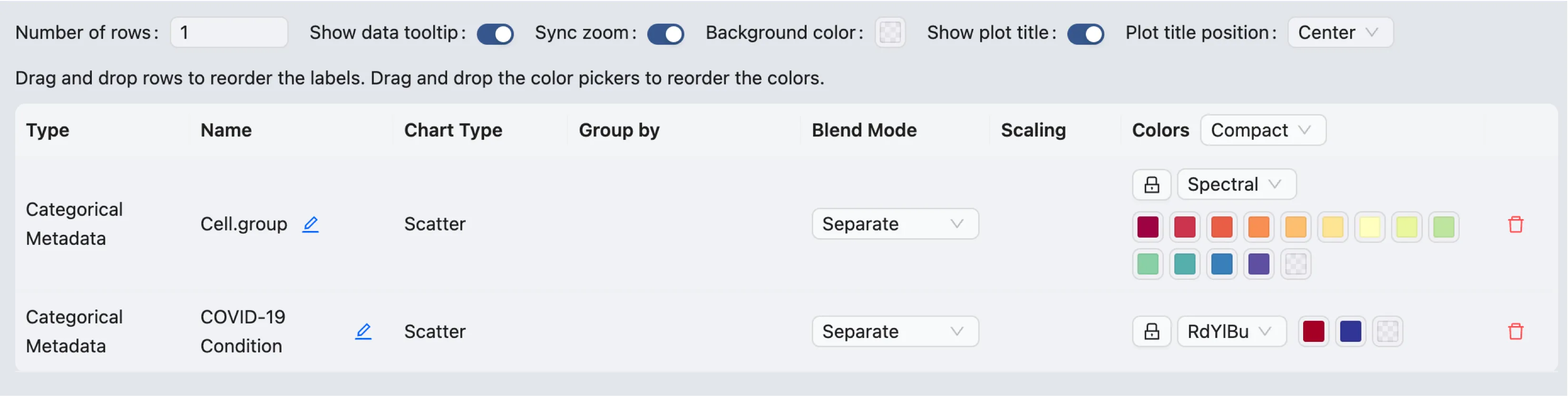 To filter data for individual plots, simply click on the plot legend to filter the data points for categorical labels, or drag the range slider to filter the data points for continuous labels.