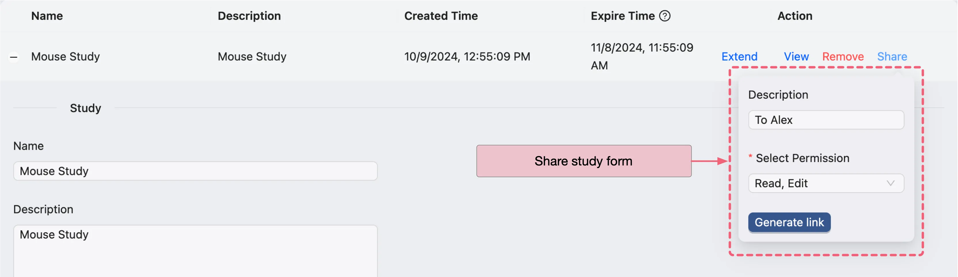 Viewbutton: Access the study dashboard for data analysisRemovebutton: Permanently delete the study and associated dataSharebutton: Collaborate with colleagues by sharing the study. See details below.Extendbutton: Extend the study's expiration date. See details below.+icon: Expand study details to:Update study name and description using the update form